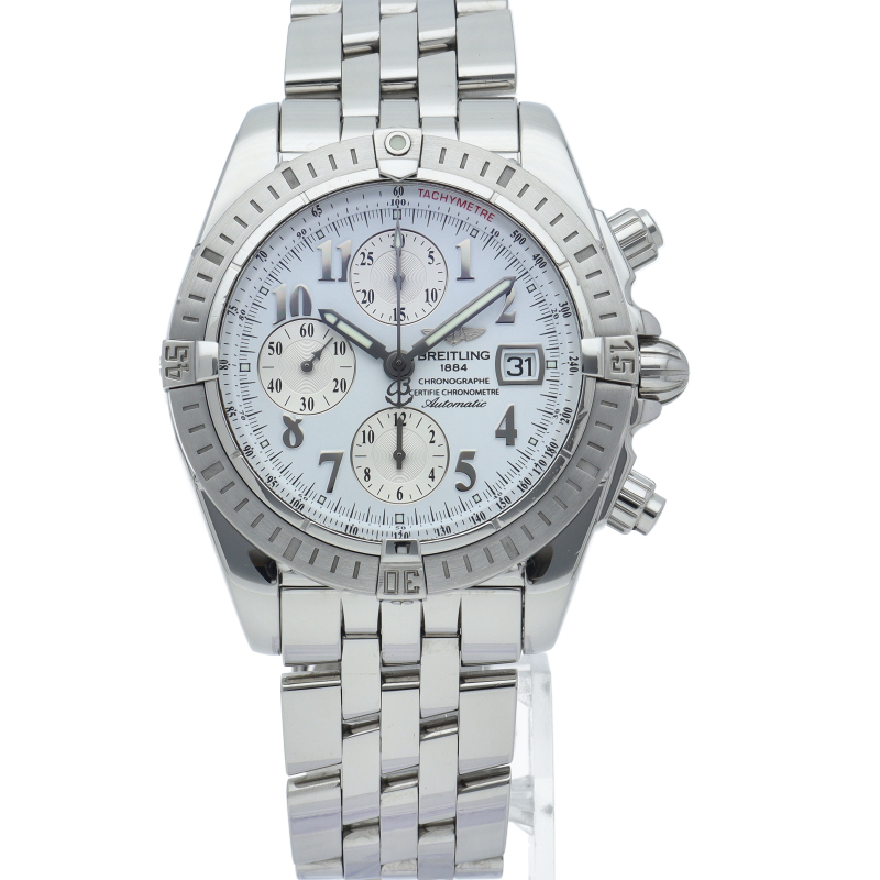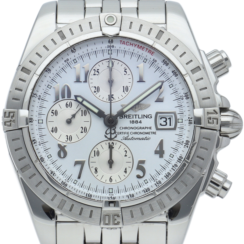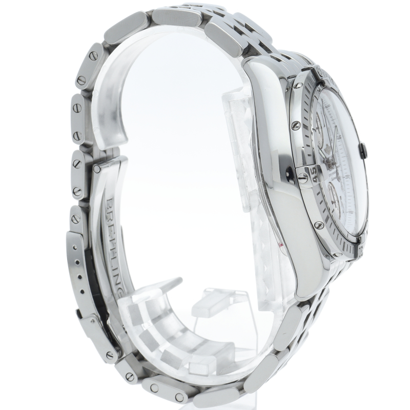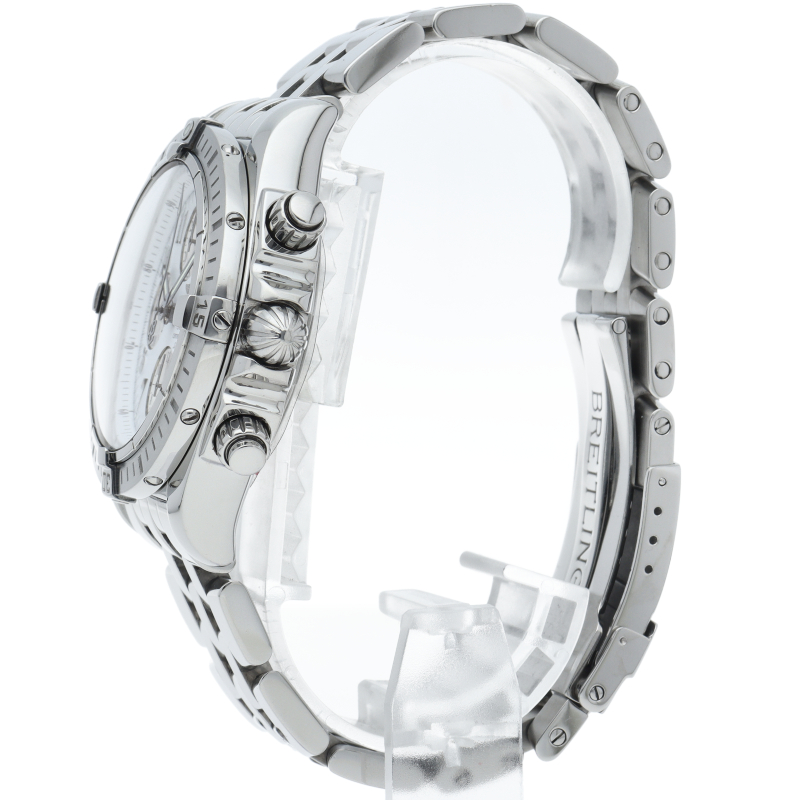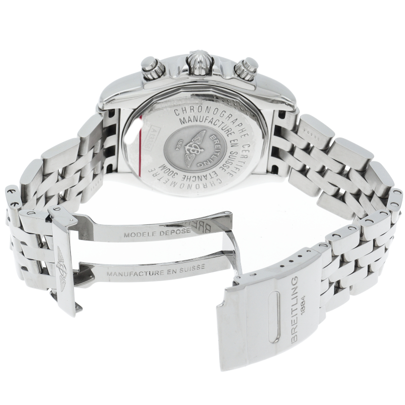 ブライトリングの生産終了となった人気モデル。存在感のあるビッグケースにデイト表示・逆回転防止ベゼルを備えたデザイン性と実用性の兼ね備えた1本。A13356/A156A73PA