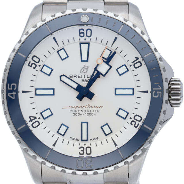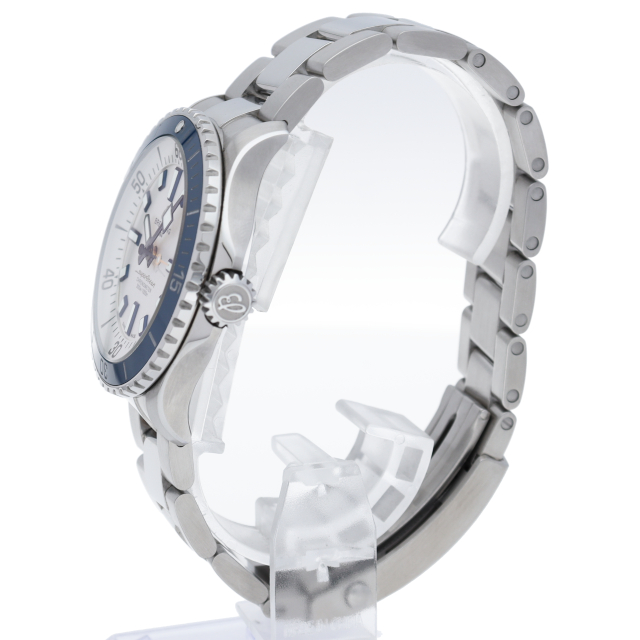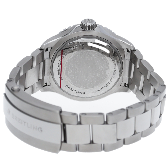 夜光性のスーパールミノバでコーティングされた幅広の針とインデックスにより、水中での優れた視認性を実現しました。 300mの防水性能は、ダイバーズウォッチに求められる最低条件の3倍に相当します。 自動巻きブライトリングキャリバー17搭載。A17375(A17375E71G1A1)。