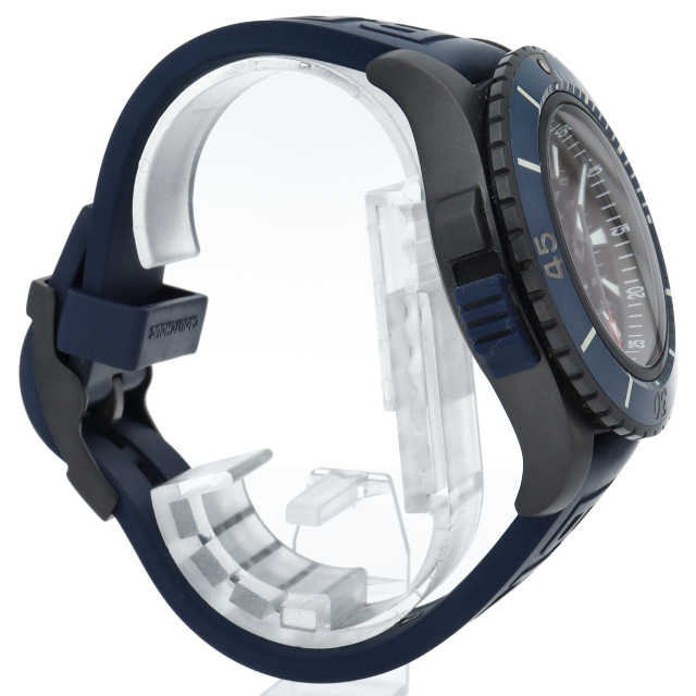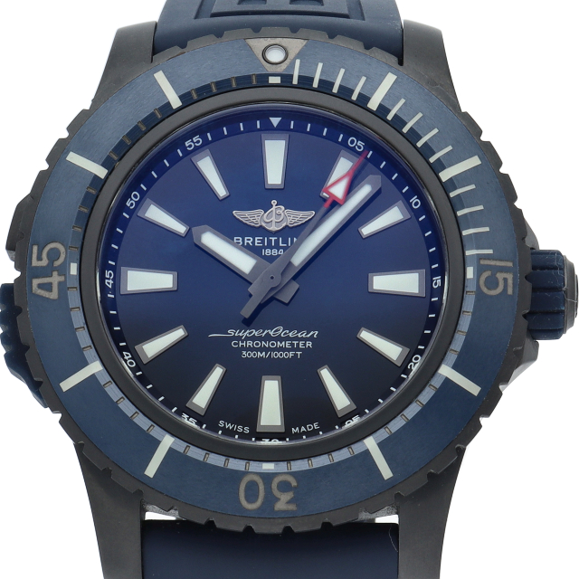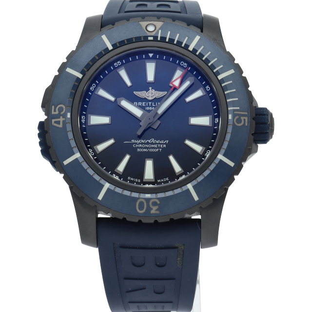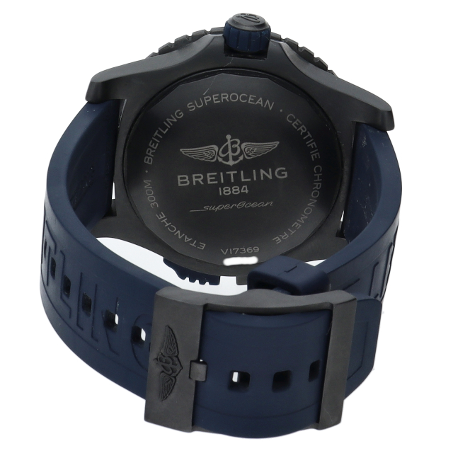 スーパーオーシャン オートマチック48は迫力の直径48mmのブラック・チタンケース(DLCコーティングを施したチタン)に耐久性に優れたブルーセラミックベゼルを合わせた、プロフェッショナルダイバーウォッチです。軟鉄製インナーケースを採用することでムーブメントを磁界の影響から守り、また9時位置のケースサイドに設けたロック機構によりベゼルの誤作動を防ぎます。V17369(V17369161C1S1)
