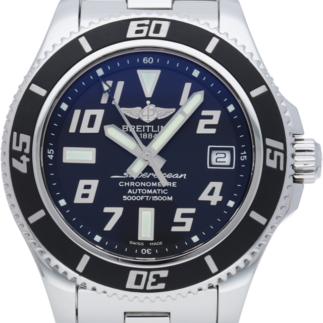 ブライトリングの本格派ダイバーズウォッチ「スーパーオーシャン42」。逆回転防止ベゼルにエスケープバルブ、1500Mの防水機能搭載で高級感の増した1本。別名「スーパーオーシャン2」。A17364(A187B28PRS)