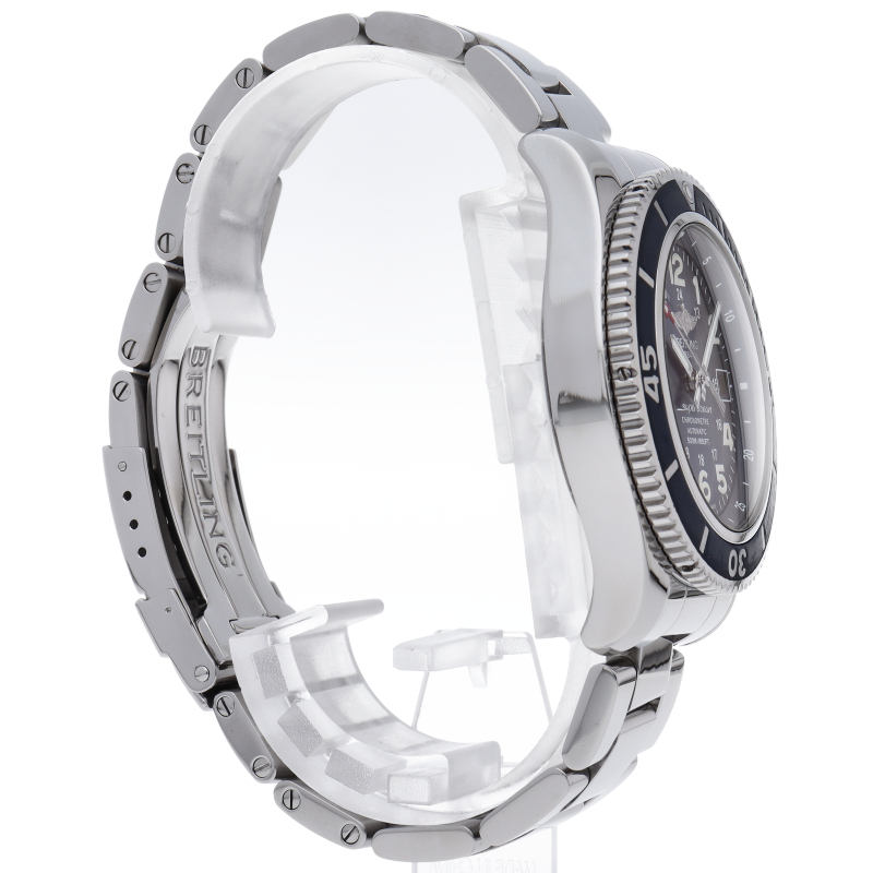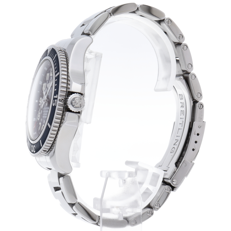 1957年から続くブライトリングを代表するダイバーズウォッチの「スーパーオーシャン」。ダイバーウォッチとして充分な500mもの防水性能を確保しながらも、ケースをスリムかつ軽量化したことにより、ダイビング以外にもオールマイティに使いやすくなっています。内側に24時間表記をプリントしたアラビアインデックス文字盤が、90年代後半のスーパーオーシャンを彷彿させる一本です。A17365(A17365D11C1A1)