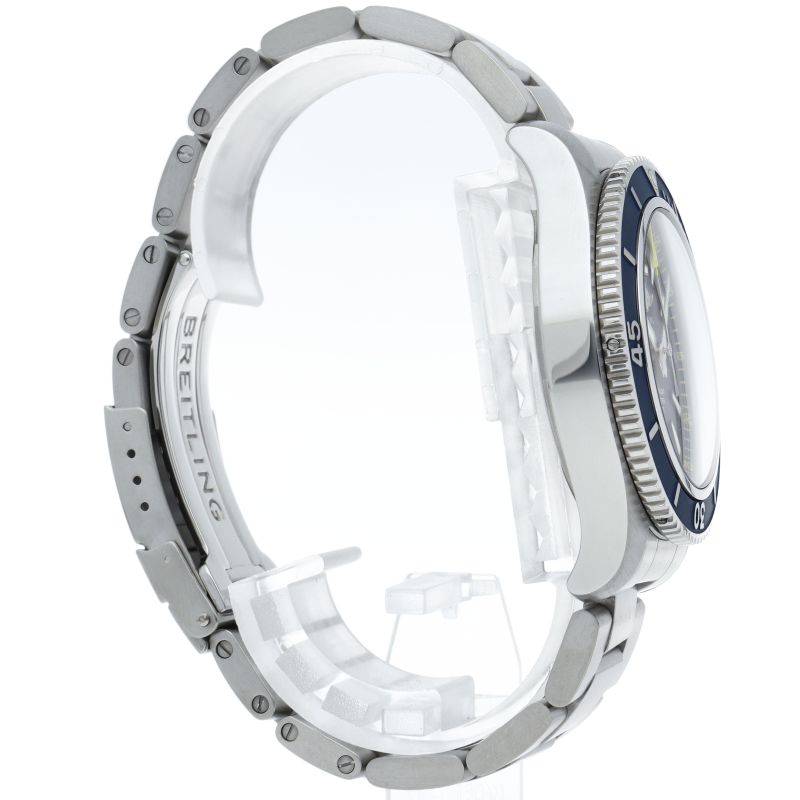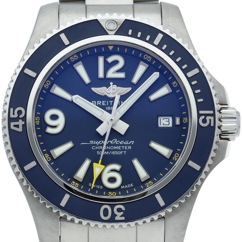 スポーティかつフレッシュでカラフルなスーパーオーシャン オートマチック 42は、優れたパフォーマンスに、どんな手首周りにもフィットするコンテンポラリーなスタイルを加えたモデルです。レギュラーラインナップにはないブルーダイヤルとイエローの秒針を組み合わせたスーパーオーシャン オートマチック42。日本限定300本。A17366/A173661A1C1A1
