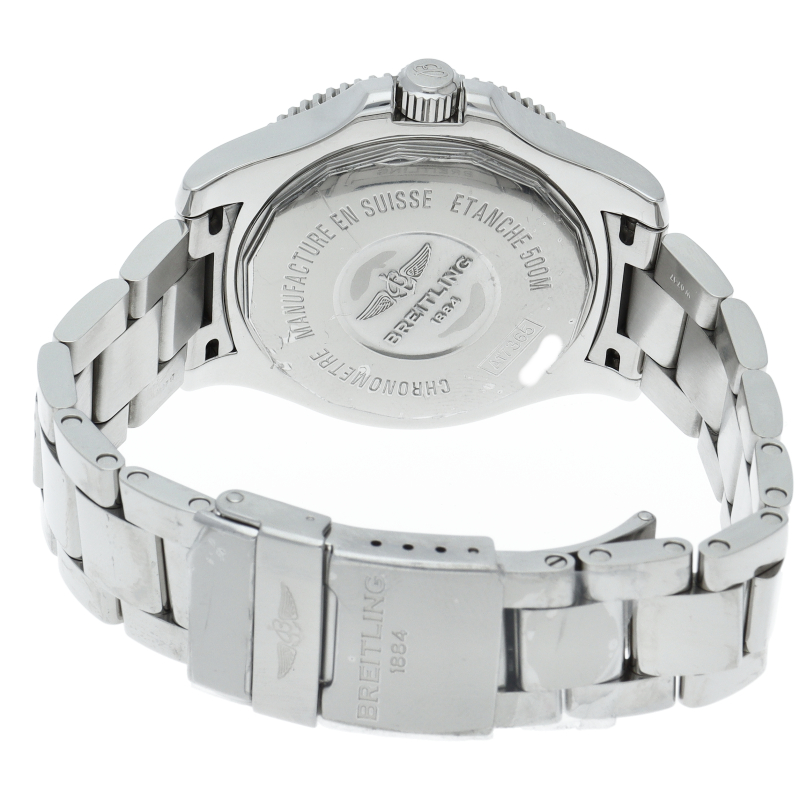 1957年から続くブライトリングを代表するダイバーズウォッチの「スーパーオーシャン」。ダイバーウォッチとして充分な500mもの防水性能を確保しながらも、ケースをスリムかつ軽量化したことにより、ダイビング以外にもオールマイティに使いやすくなっています。内側に24時間表記をプリントしたアラビアインデックス文字盤が、90年代後半のスーパーオーシャンを彷彿させる一本です。A17365/A17365D1/C957