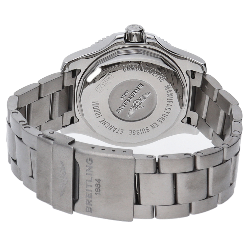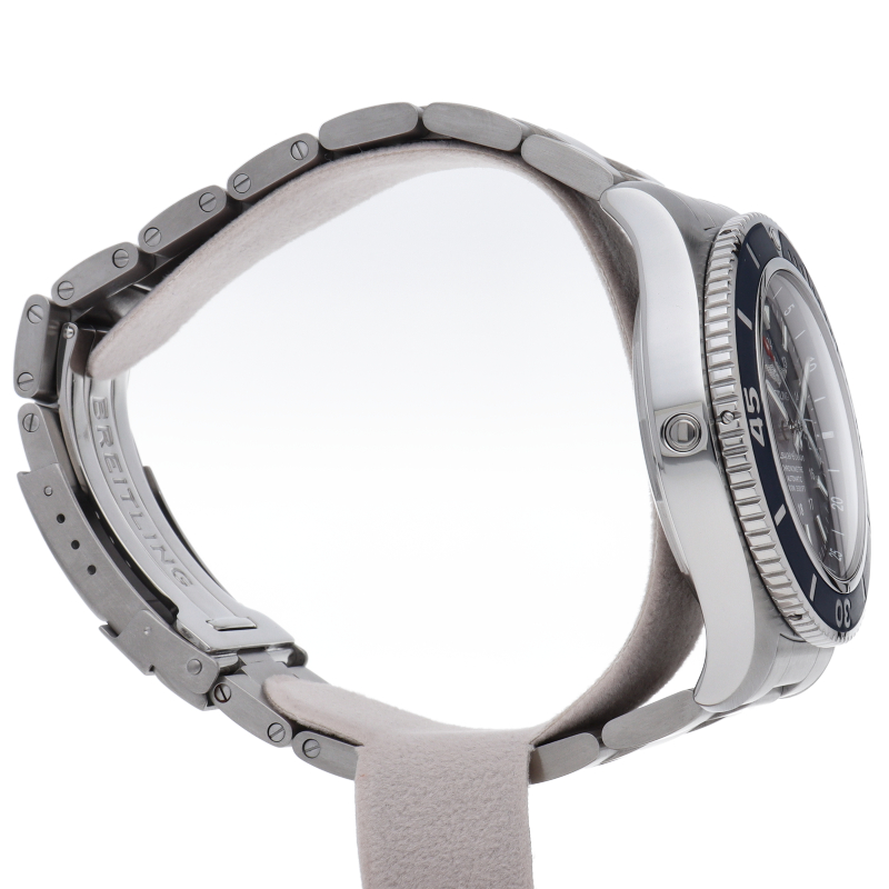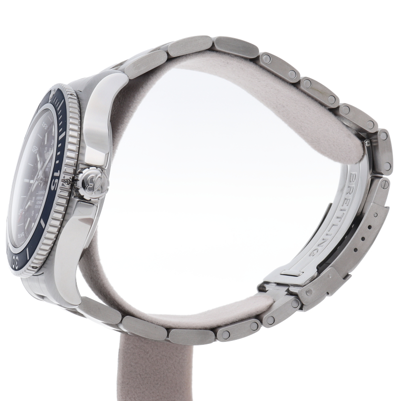 従来のスーパーオーシャン44では、厚みが約16.5mmに対し、新作では約14.5mmと、あえて防水性を下げる事で厚みがスリムになり軽量化を実現。ダイバーズウォッチの中では普段使いにも使用しやすいモデルに進化しました。A17392/A17392D8/CA09。