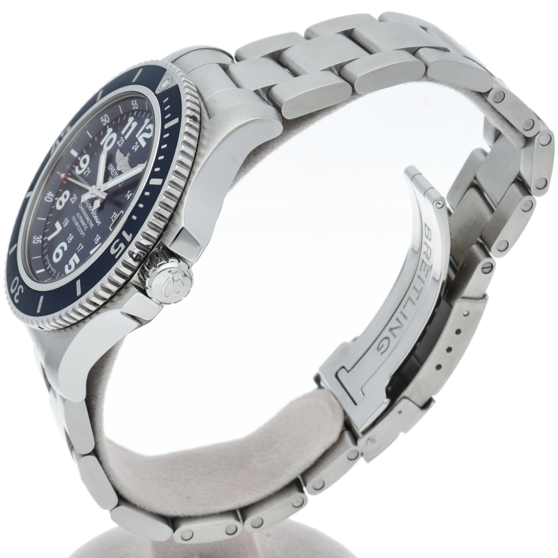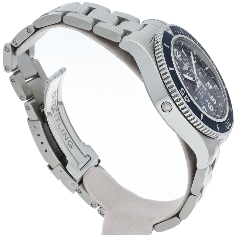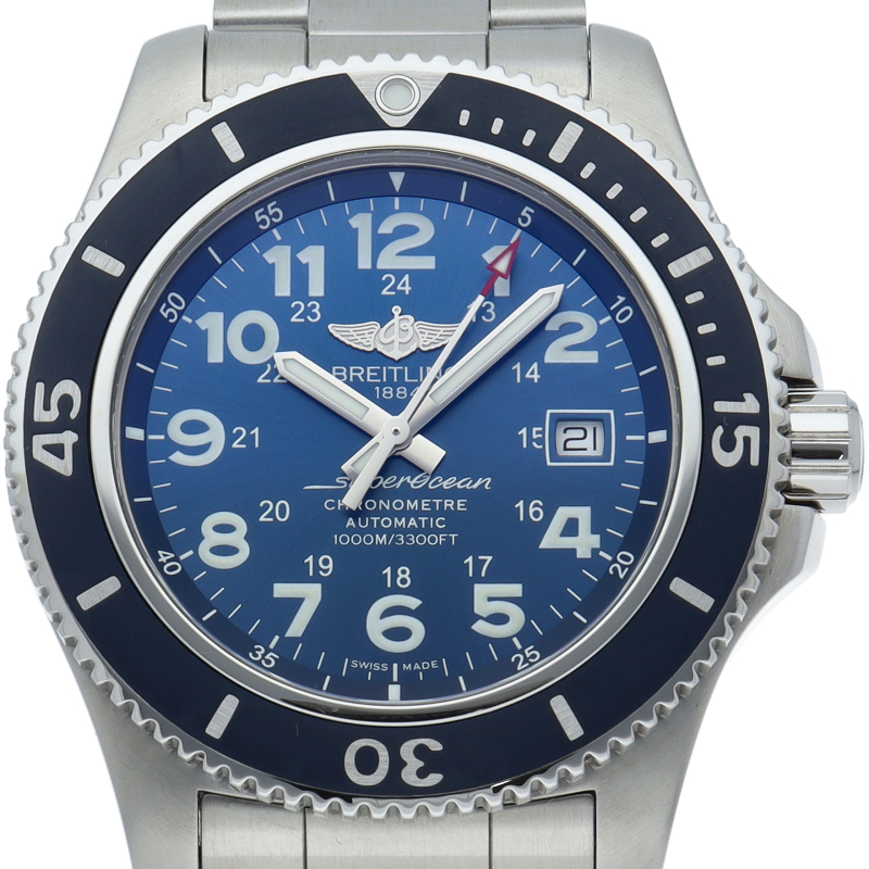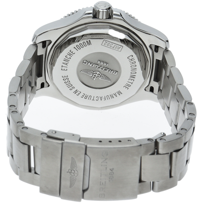 スーパーオーシャンシリーズから「スーパーオーシャンII」が登場。従来のスーパーオーシャンに比べ厚みが薄くなり軽量化されました。飽和潜水時にヘリウムガスを自動で排出するオートエスケープバルブを標準採用し、1000メートルもの防水を実現。ムーブメントには自動巻きクロノメータームーブメント・ブライトリング17を搭載しています。大きめのアラビアインデックスで非常に視認性に優れた一本です。A17392/A17392D8/C910。