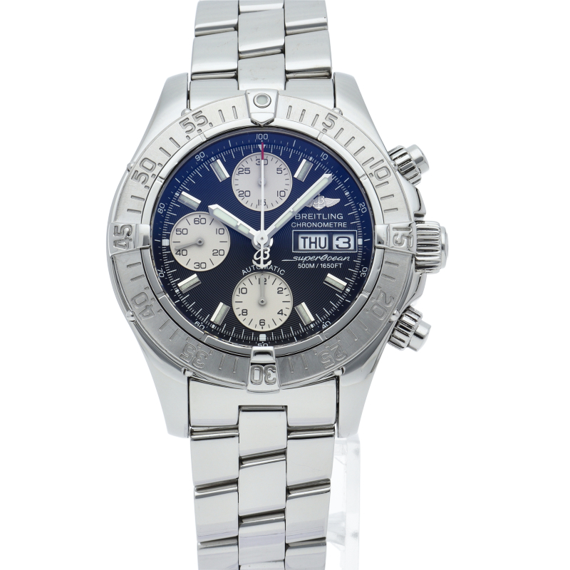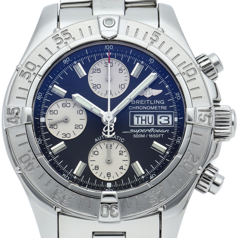 ブライトリングの本格派ダイバーズウォッチ「スーパーオーシャン」にクロノグラフ・デイデイト表示等が搭載された多機能モデル。防水機能もハイスペックな1本です。