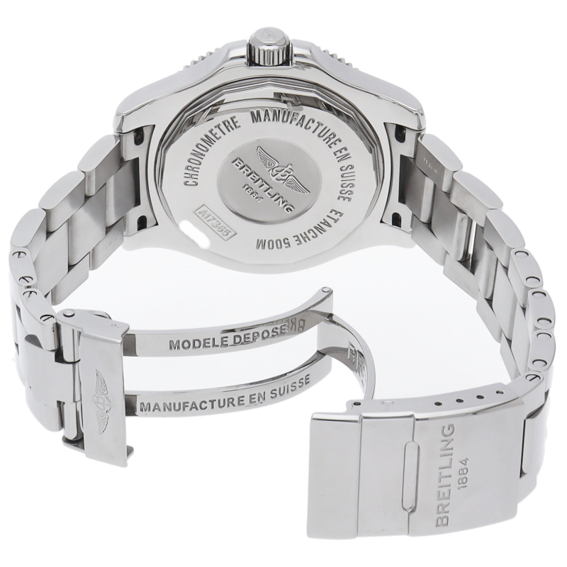 1957年から続くブライトリングを代表するダイバーズウォッチの「スーパーオーシャン」。ダイバーウォッチとして充分な500mもの防水性能を確保しながらも、ケースをスリムかつ軽量化したことにより、ダイビング以外にもオールマイティに使いやすくなっています。内側に24時間表記をプリントしたアラビアインデックス文字盤が、90年代後半のスーパーオーシャンを彷彿させる一本です。A17365/A17365D1/C915。