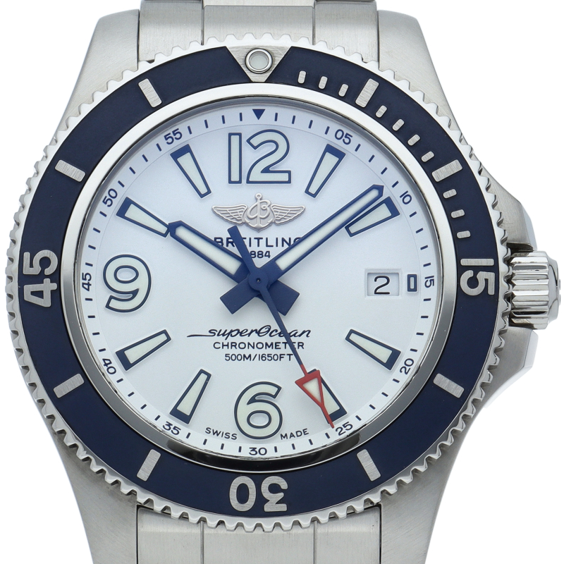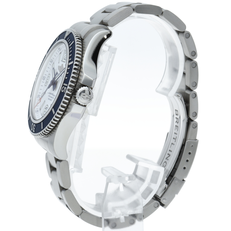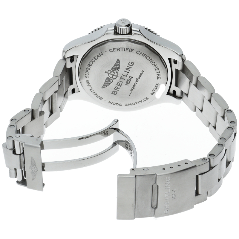 パワーと機能性、そしてクールかつコンテンポラリーなスタイルを特色とするスーパーオーシャン オートマチックコレクション。ラチェット式逆回転防止ベゼルを装備し、さらにプロフェッショナルダイバーウォッチとして500mもの防水性能を確保します。また視認性を高めるためにルミノバ夜光を塗布したインデックスは大きく、針は太く、秒針先端の三角部分にはオレンジのペイントが施されています。
