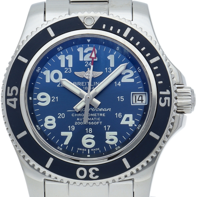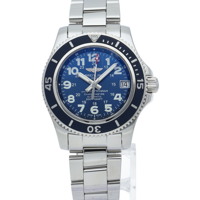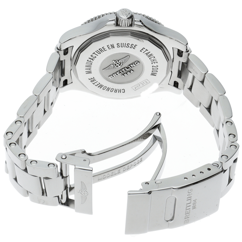 1957年から続くブライトリングを代表するダイバーズウォッチの「スーパーオーシャン」。ダイバーウォッチとして充分な500mもの防水性能を確保しながらも、ケースをスリムかつ軽量化したことにより、ダイビング以外にもオールマイティに使いやすくなっています。内側に24時間表記をプリントしたアラビアインデックス文字盤が、90年代後半のスーパーオーシャンを彷彿させる一本です。A17312/A17312D1/C938。