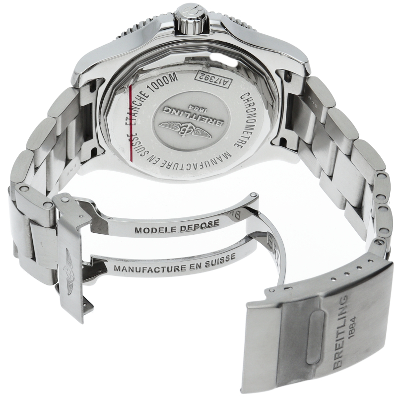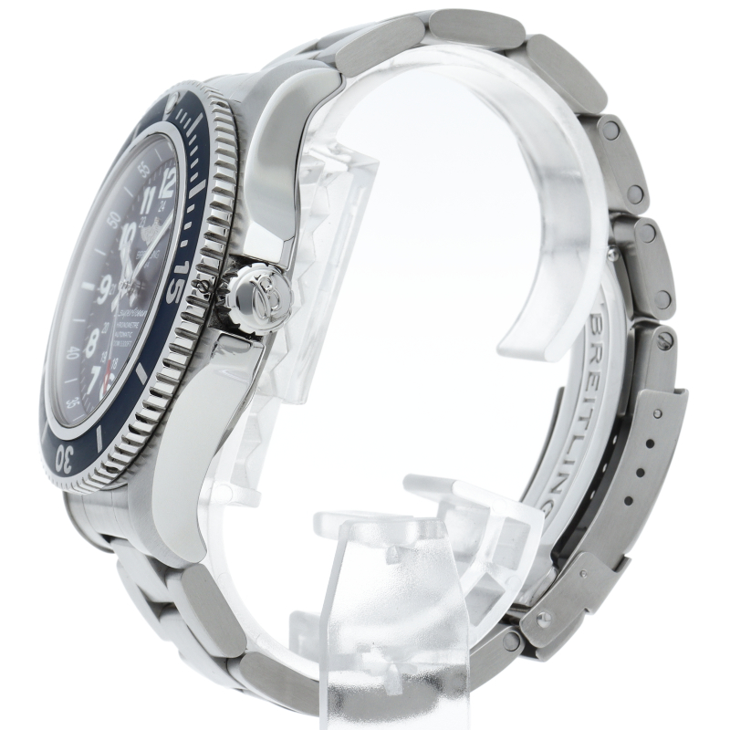 スーパーオーシャンシリーズから「スーパーオーシャンII」が登場。従来のスーパーオーシャンに比べ厚みが薄くなり軽量化されました。飽和潜水時にヘリウムガスを自動で排出するオートエスケープバルブを標準採用し、1000メートルもの防水を実現。ムーブメントには自動巻きクロノメータームーブメント・ブライトリング17を搭載しています。大きめのアラビアインデックスで非常に視認性に優れた一本です。A17392/A192C10PSS。