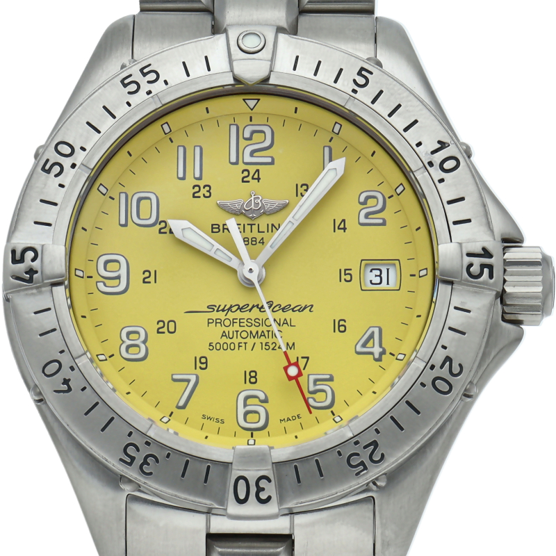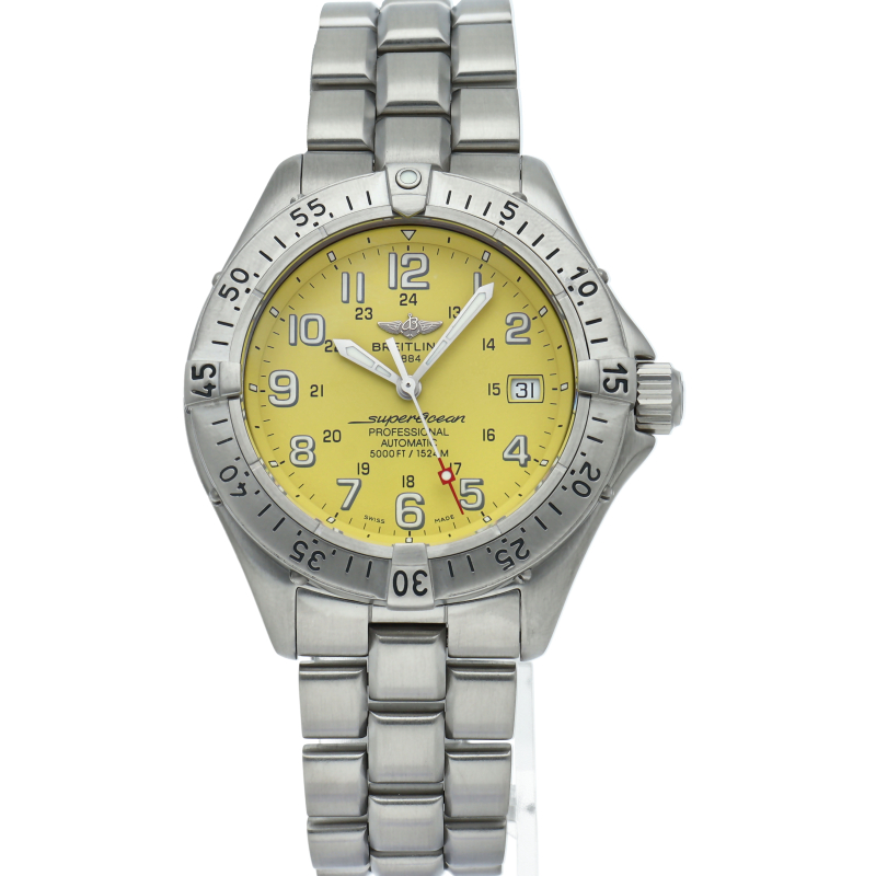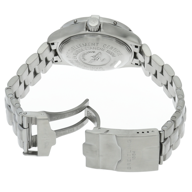 ブライトリングの本格派ダイバーズウォッチ「スーパーオーシャン」。逆回転防止ベゼルにエスケープバルブがついた、レトロな雰囲気を醸し出しつつもしっかりとした、ダイバーズウォッチでございます。A17345。