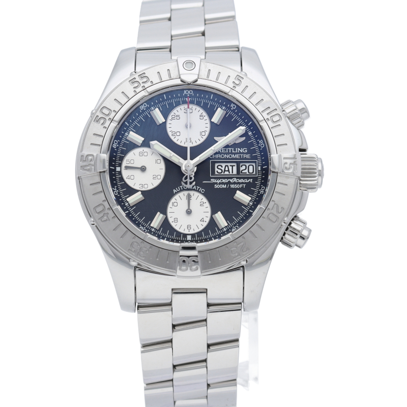 ブライトリングの本格派ダイバーズウォッチ「スーパーオーシャン」にクロノグラフ・デイデイト表示等が搭載された多機能モデル。防水機能もハイスペックな1本です。A13340/A111B83PRS。