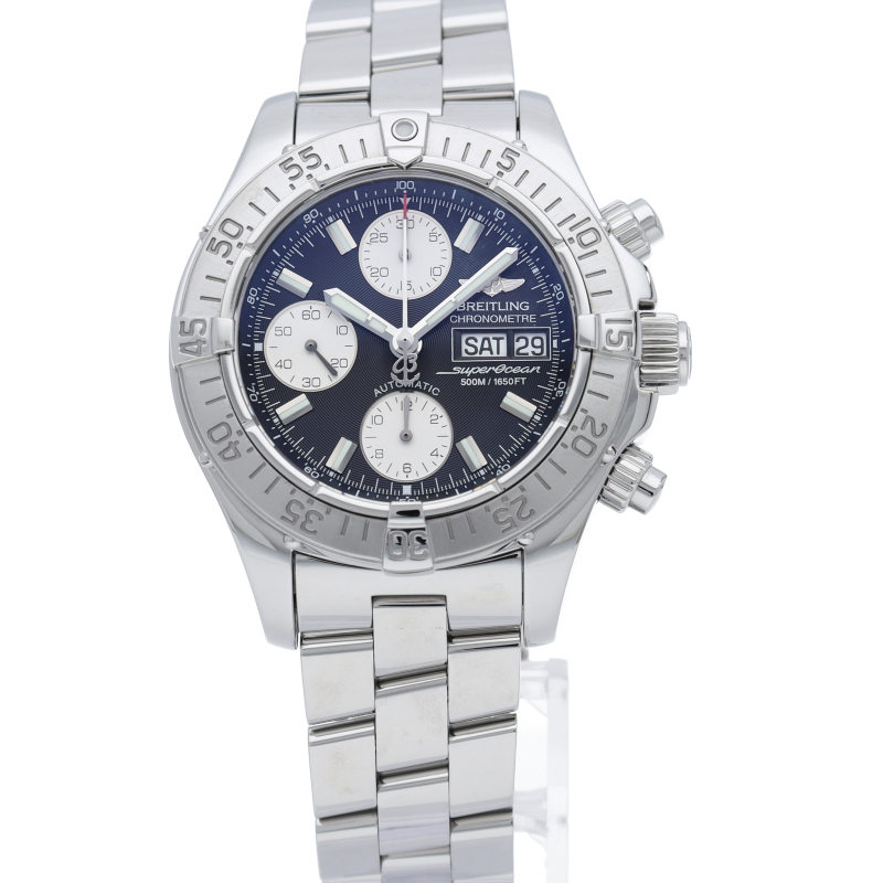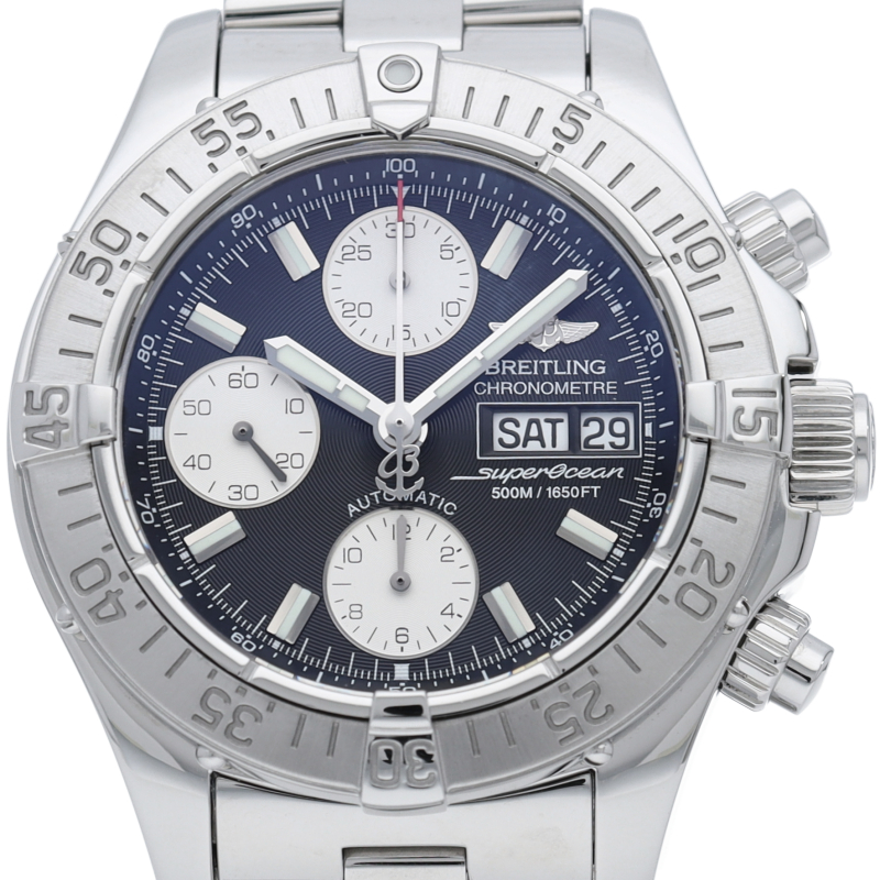 ブライトリングの本格派ダイバーズウォッチ「スーパーオーシャン」にクロノグラフ・デイデイト表示等が搭載された多機能モデル。防水機能もハイスペックな1本です。A13340/A111B83PRS。