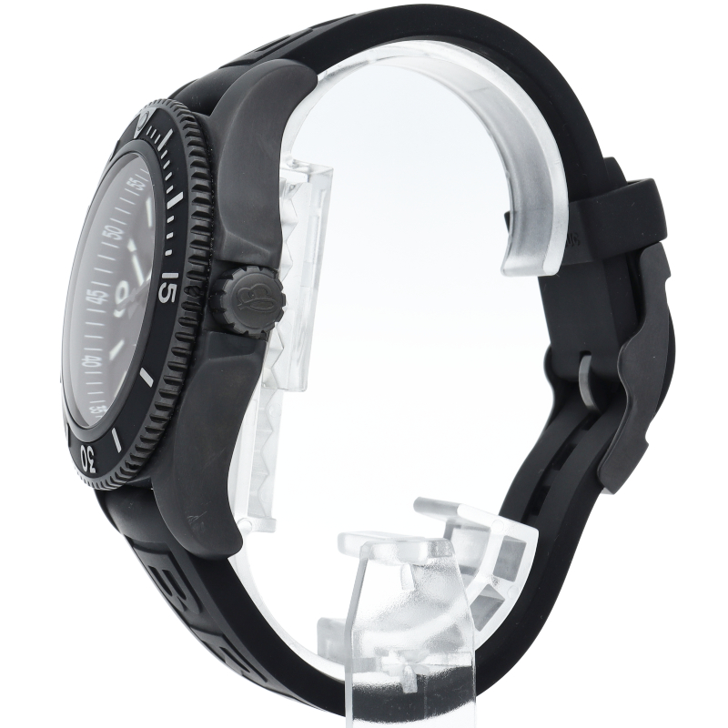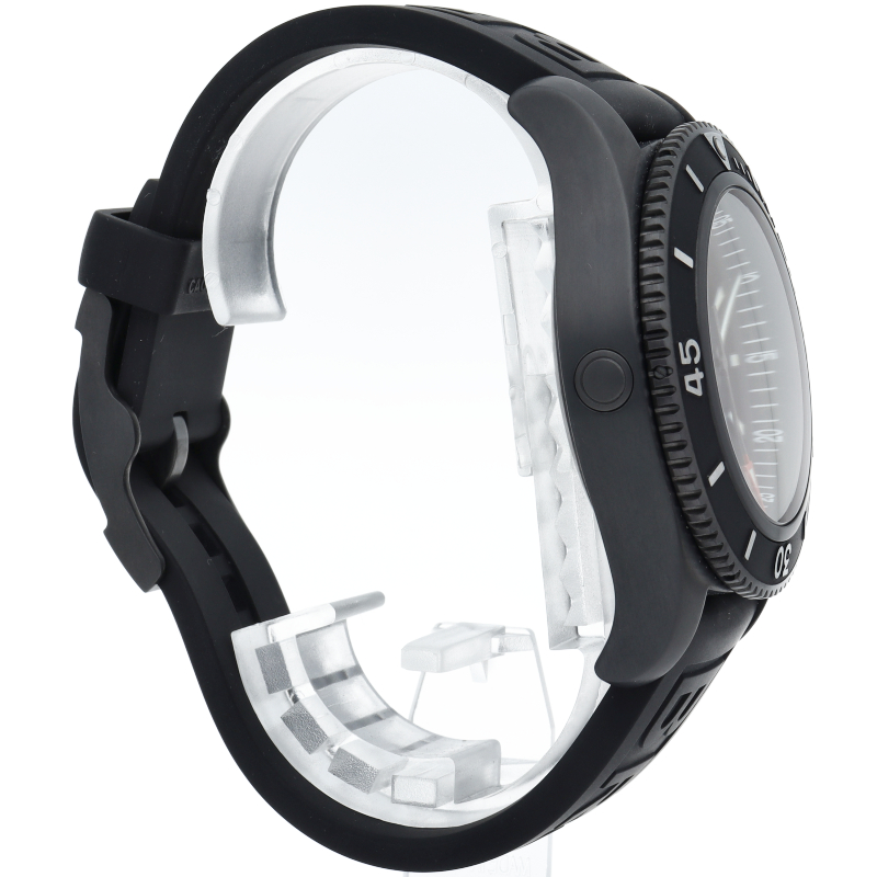 ブラックスチールのケースとラバーストラップの組み合わせは、スポーティで精悍な印象を与えます。