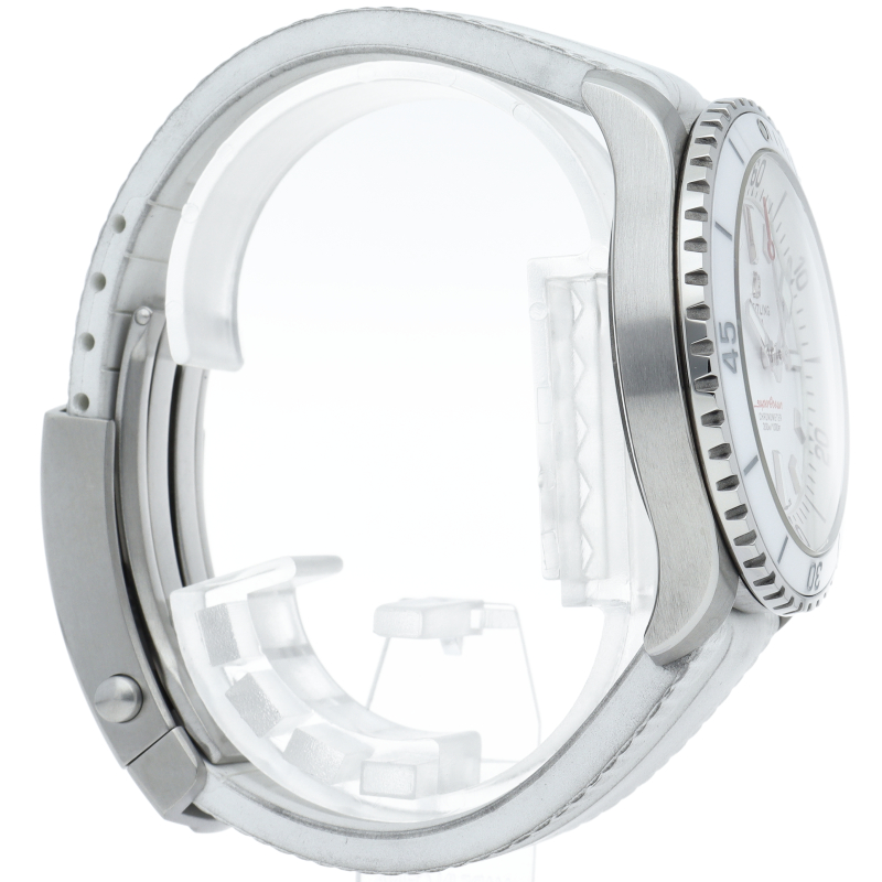 スーパーオーシャンはダイビングタイム計測のうえで欠かせない幅広の回転ベゼル、視認性高い文字盤やしっかりとした時分針を有した、当初から完成されたダイバーズウォッチです。人気の高かった「スローモーション」のデザインコードを踏襲しながらも、セラミックインレイベゼルや鮮やかな色のダイアルなど現代的な特徴を加味しています。ジャパンエディションモデルです。