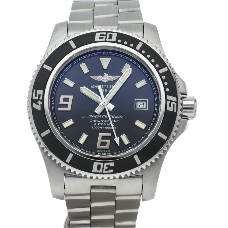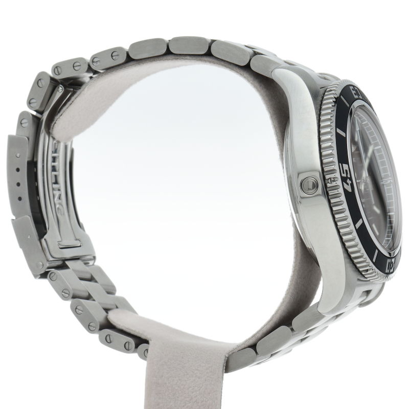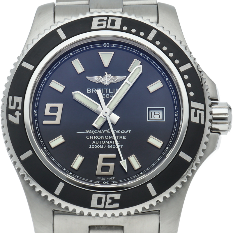 ブライトリングの本格派ダイバーズウォッチ「スーパーオーシャン44」。逆回転防止ベゼルにエスケープバルブ、44ミリのケースサイズは重厚感があり、ブラックのダイアルに視認性の良いインデックスが格好良い時計です。高級感の増した1本。A17391/A1739102/BA77。