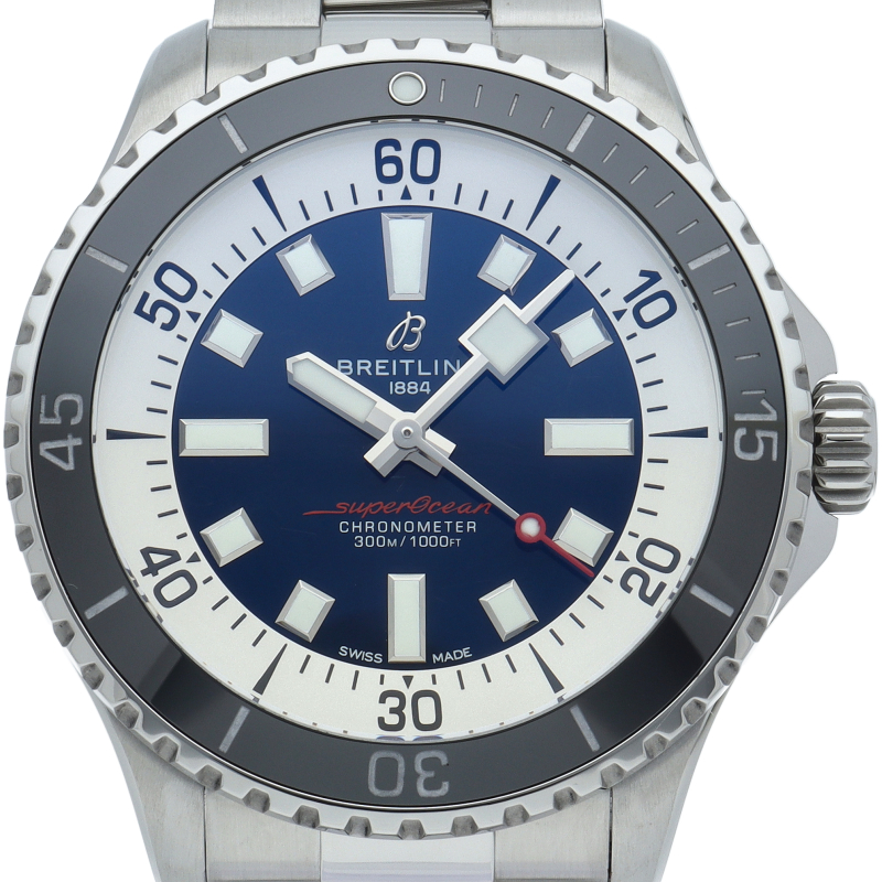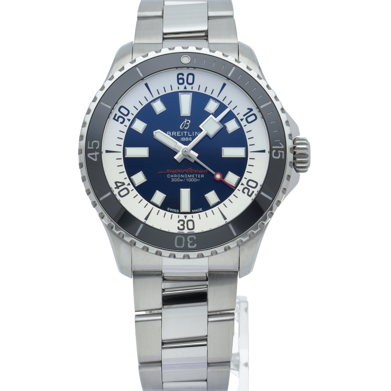 スーパーオーシャン オートマチック44は直径44mmケースを採用した、どんな過酷なウォータースポーツにも耐えうる新しい2022年発表のダイバーウォッチです。夜光性のスーパールミノバでコーティングされた幅広の針とインデックスにより、水中での優れた視認性を実現し、防水性能は、300mあります。マリンスポーツからビジネスシーンまで多岐にわたり活躍することのできるシリーズになっております。