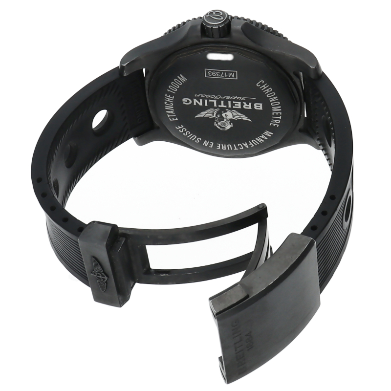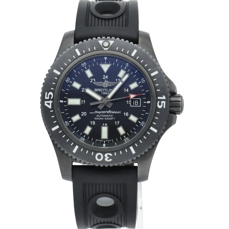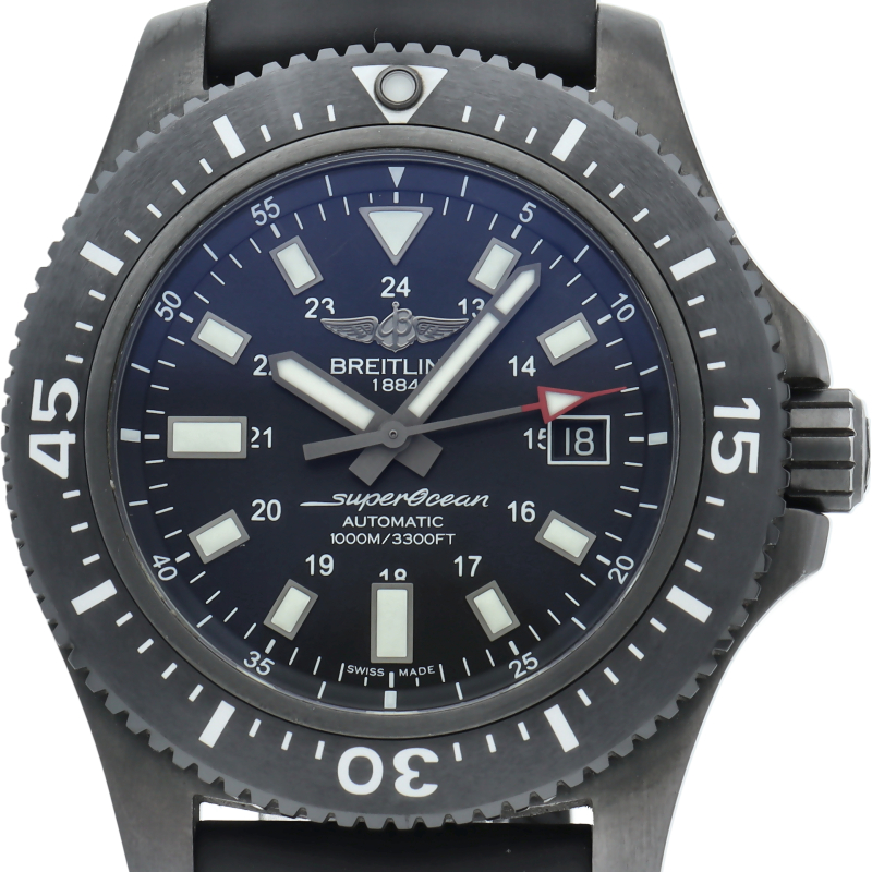 ブライトリングの本格派ダイバーズウォッチ「スーパーオーシャン44」。逆回転防止ベゼルにエスケープバルブ、44ミリのケースサイズは重厚感があり、ブラックのダイアルに視認性の良いインデックスが格好良い時計です。高級感の増した1本。M17393/M1739313/BE92。