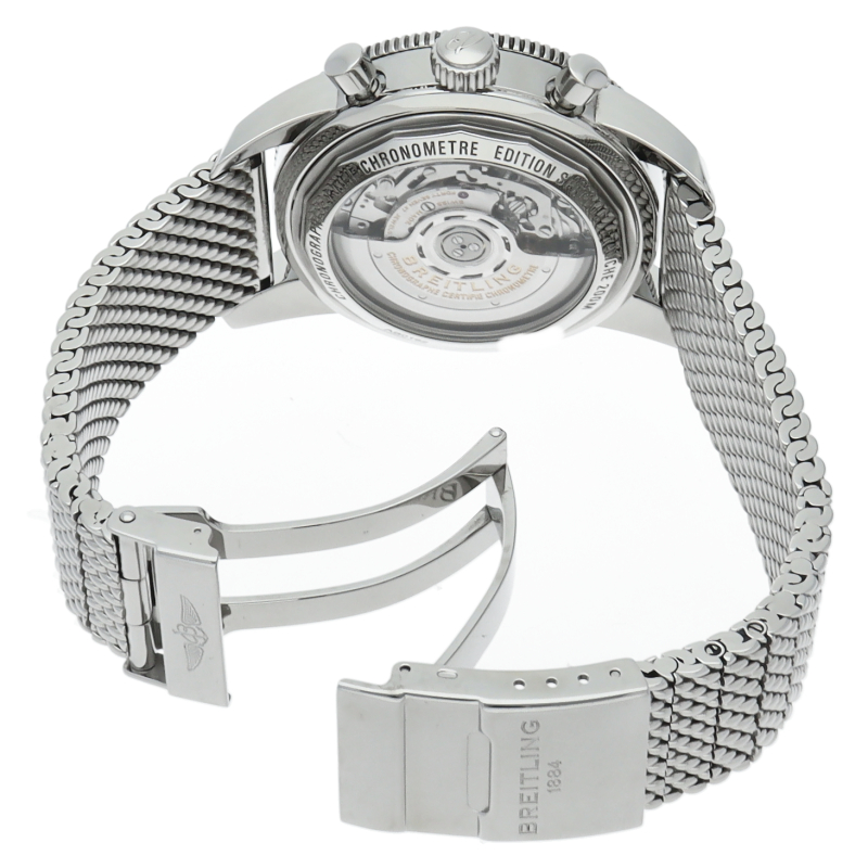 ブライトリング完全自社製ムーブメント、「Cal.01」を搭載した、シリーズ最高と謳えるモデル。「Cal.01」を搭載したことによりクロノグラフの精度がさらに向上。大きめのリューズは巻き心地がよく、また操作性も高くなっています。鏡面仕上げの美しいステンレスが、装着感に優れるクラシックブレスの魅力を際立たせます。防水性も200m防水と高く、ダイバーズウォッチとしてもふさわしい性能です。AB0162/AB0162121B1A1