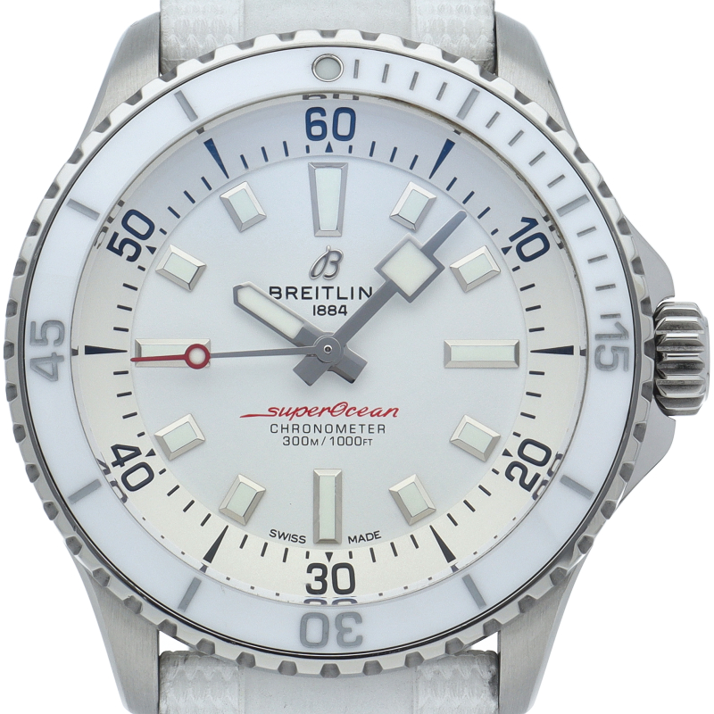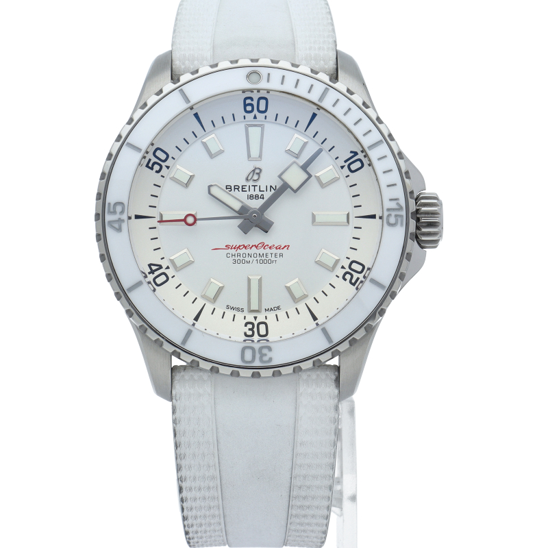 夜光性のスーパールミノバでコーティングされた幅広の針とインデックスにより、水中での優れた視認性を実現しました。 300mの防水性能は、ダイバーズウォッチに求められる最低条件の3倍に相当します。 自動巻きブライトリングキャリバー17搭載。A17375/A17375A71A1S1