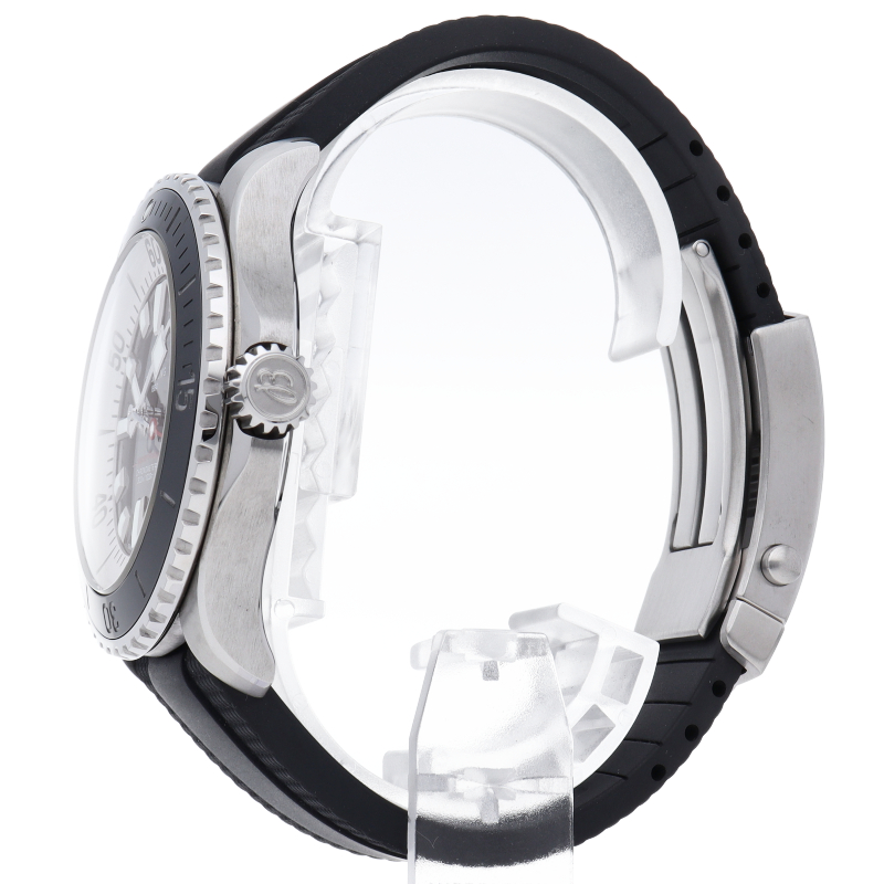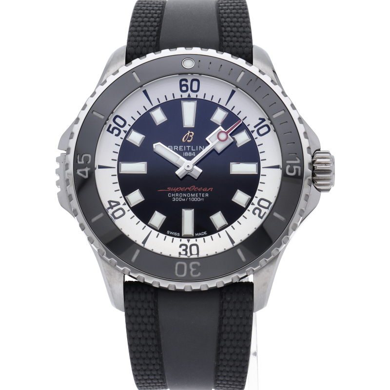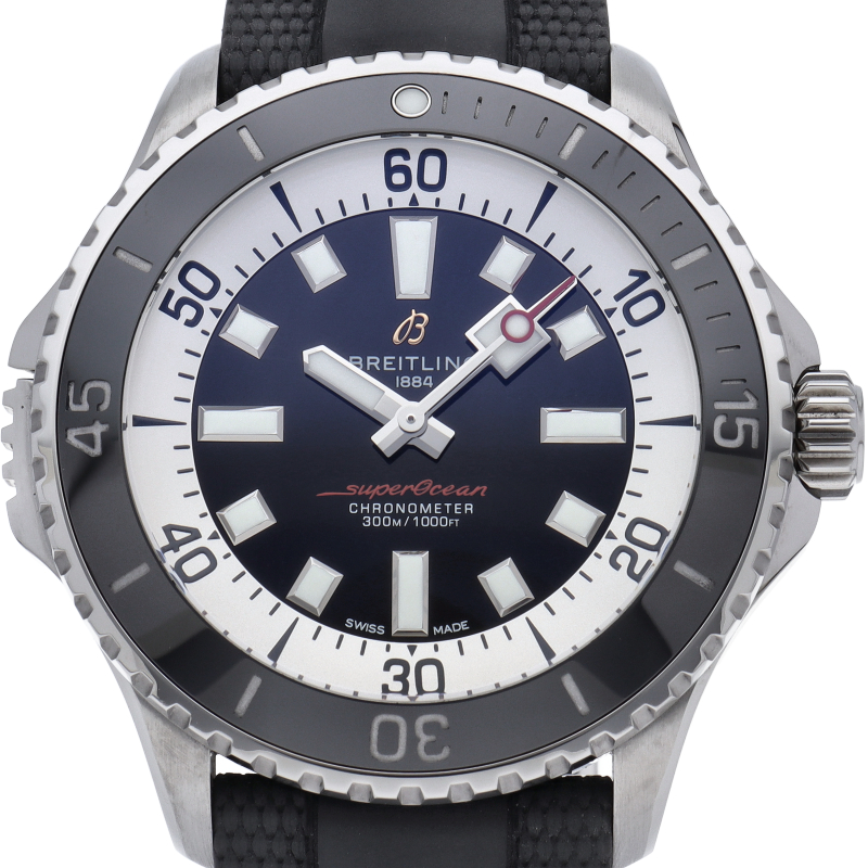 どんな過酷なウォータースポーツにも耐えうる2022年発売のダイバーウォッチ「スーパーオーシャン オートマチック46」。夜光性のスーパールミノバでコーティングされた幅広の針とインデックスにより、水中での優れた視認性を実現しました。文字盤色も遊び心の有るカラーバリエーションが揃い、マリンスポーツからビジネスシーンまで多岐にわたり活躍することのできるシリーズになっております。A17378/A17378211B1S1。