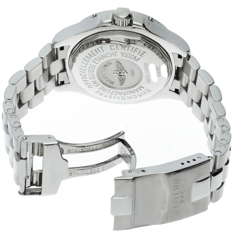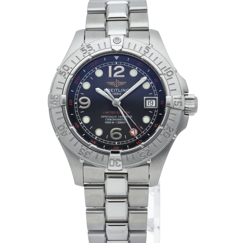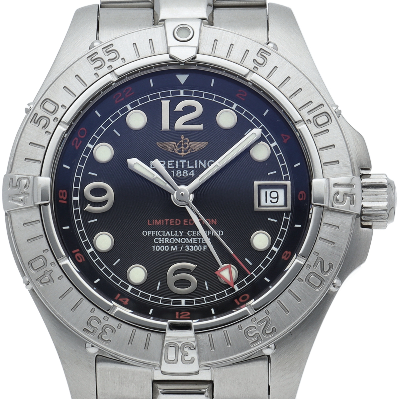 1957年の発表以来、常に高い評価とスペックを兼ね備えてきた“スーパーオーシャン”。2005年にブラック200本、ブルー100本の日本限定にて生産されたこのモデルは、スーパーオーシャンスティールフィッシュに24時間を表すGMT機能を追加した限定モデルです。A32360/A326B05PFA