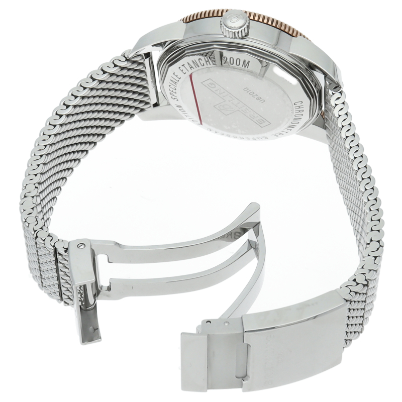 ブライトリングの海洋分野における先駆者となったスーパーオーシャン。スーパーオーシャン・ヘリテージはその歴史的ダイバーウォッチへのオマージュとして誕生から60周年を迎えてリメイクされたモデルです。ベゼルプレートは耐傷性・耐久性に優れたハイテクセラミックベゼルを初採用し、時・分針もより視認性の高い形状のものに変更され、シンプルでありながらもブライトリングらしさのあるデザインです。UB2010/UB2010121B1A1。