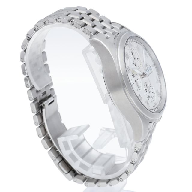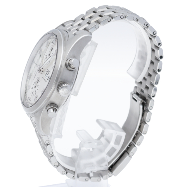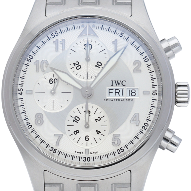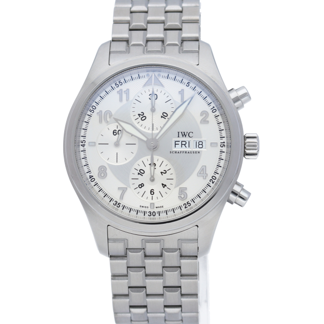 IWCの大人気モデル「パイロットウォッチ」シリーズから、実在した戦闘機の名を冠した「スピットファイア」。美しい2色のシルバーダイヤルが特徴で、クロノグラフとデイデイト機能を搭載した実用性にも富んだ1本です。視認性の高さや腕へのフィット感など、世界屈指の時計メーカー「IWC」らしさを感じる時計です。