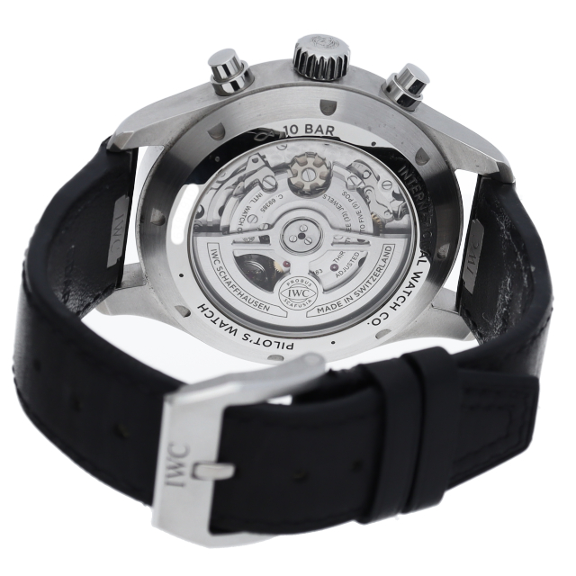 2022年新たに生まれ変わったパイロットウォッチクロノグラフ「IW378001」。新たに自社製キャリバー 69385を搭載し、ストップウォッチ機能と最長12時間までの計測が可能で、9時位置のカウンターに時単位、12時位置のカウンターに分単位の計測時間を表示。新たにサファイアガラスのシースルーバックからは、44時間から46時間に延長されたパワーリザーブを搭載する自動巻きムーブメントを鑑賞できます。