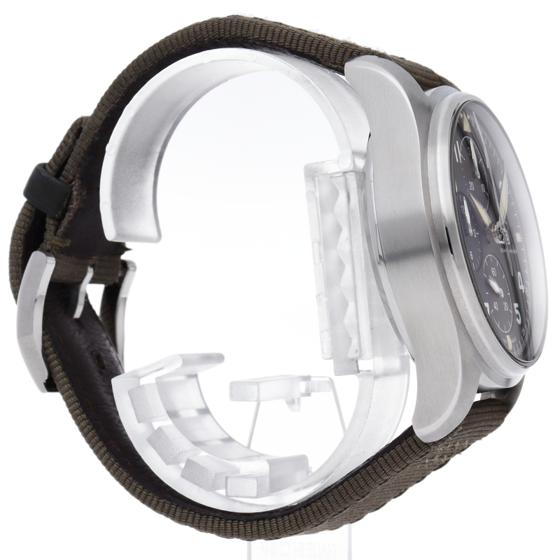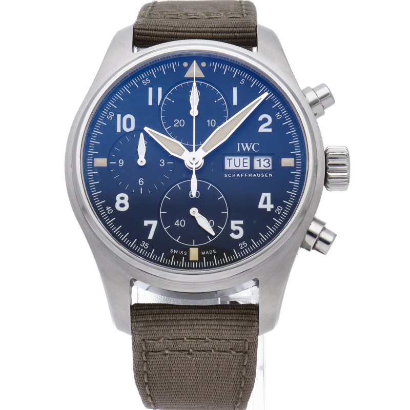 IWC史上初の、直径41mmにサイズダウンしたケースにキャリバー69000シリーズのムーブメントを搭載したパイロット・ウォッチ・クロノグラフです。伝統的なコラムホイール・デザインの頑丈なクロノグラフ・ムーブメント、IWC自社製キャリバー69380を搭載。9時位置と12時位置にある2つのサブダイヤルで計測された時間と分を表示します。
