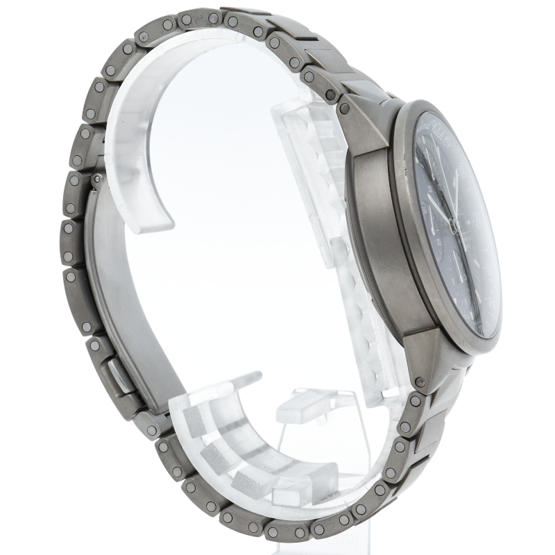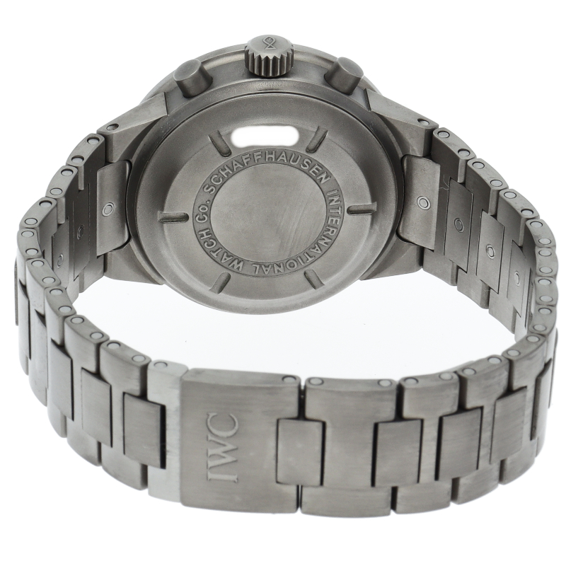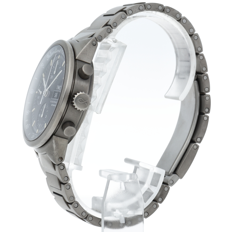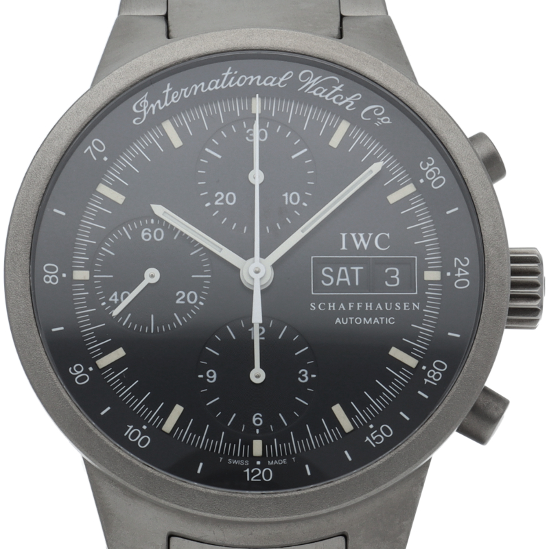 IWCの中でも人気の高いシリーズであった「GSTシリーズ」の中のクロノグラフモデルです。こちらはケースとブレスにチタンを採用した軽量モデル。傷がつき難く、金属アレルギーが出にくいのも特徴です。