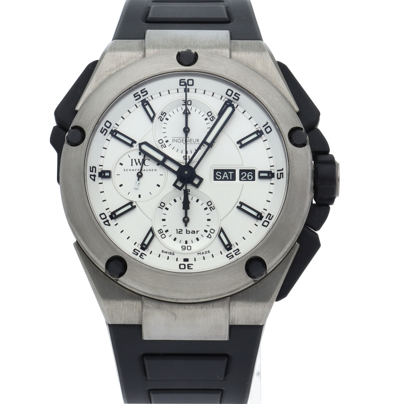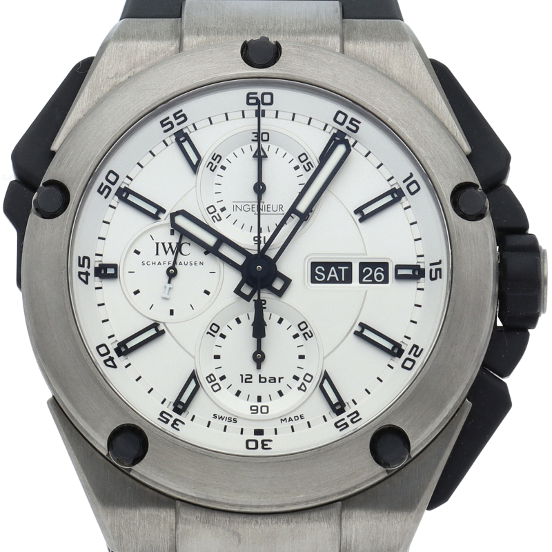 45mmの迫力あるケースにスプリットセコンドクロノグラフを搭載した「インヂュニア ダブルクロノグラフ」。ケース素材にチタンを採用しており、見た目より軽く、扱いやすい点も注目です。120mの防水機能を兼ね備えていますので、様々なシーンで活躍してくれるのではないでしょうか。