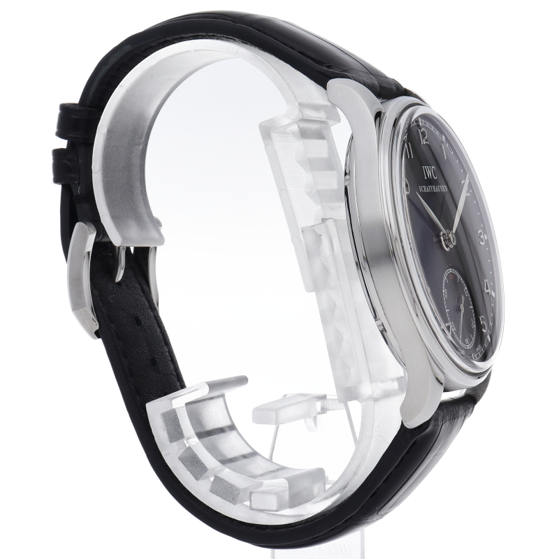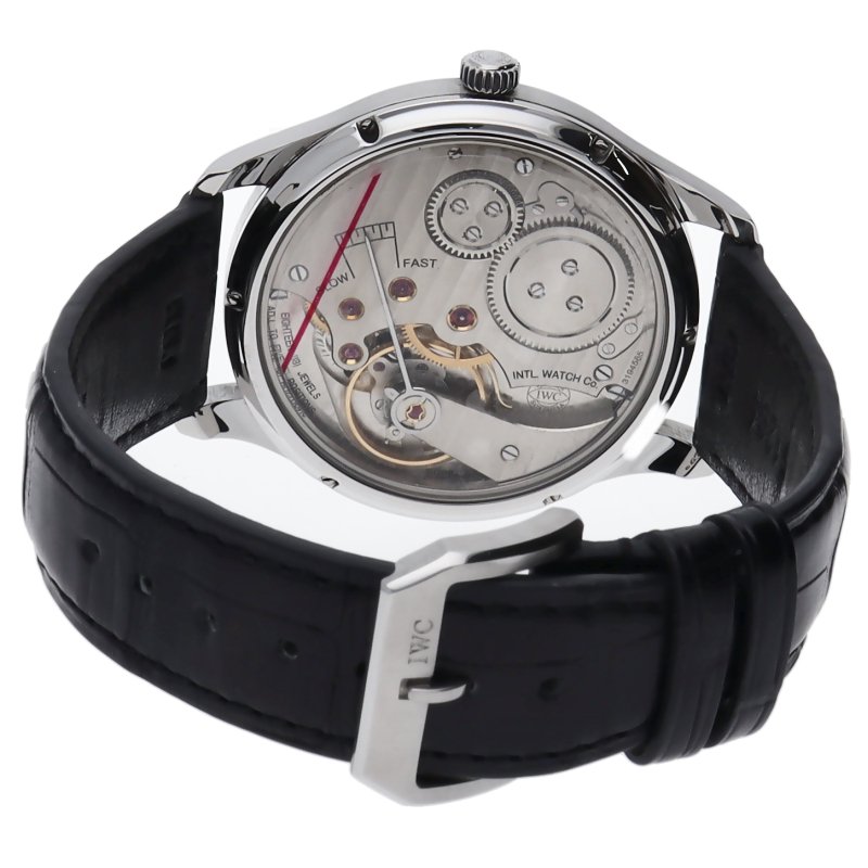 時計愛好家に贈るクラフツマンシップ「ポルトギーゼ・ハンドワインド」。長い緩急針が特徴の通称「ジョーンズキャリバー」を搭載、クラシカルなデザインがふんだんに盛り込まれたオシャレなモデルです。裏蓋はシースルーバックとなっております。