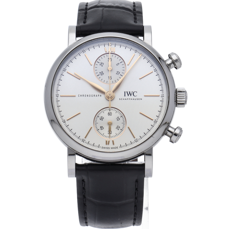 IWCの中でも特に人気の「ポートフィノ」。少し小ぶりにデザインされたクロノグラフは、腕におさまりのよいシンプルですっきりとしたデザインに。針やインデックスにゴールドカラーを効かせ、控えめながらも洗練されたフェイスはビジネスシーンにはもちろんデイリーに活躍してくれるポテンシャルを秘めた時計です。