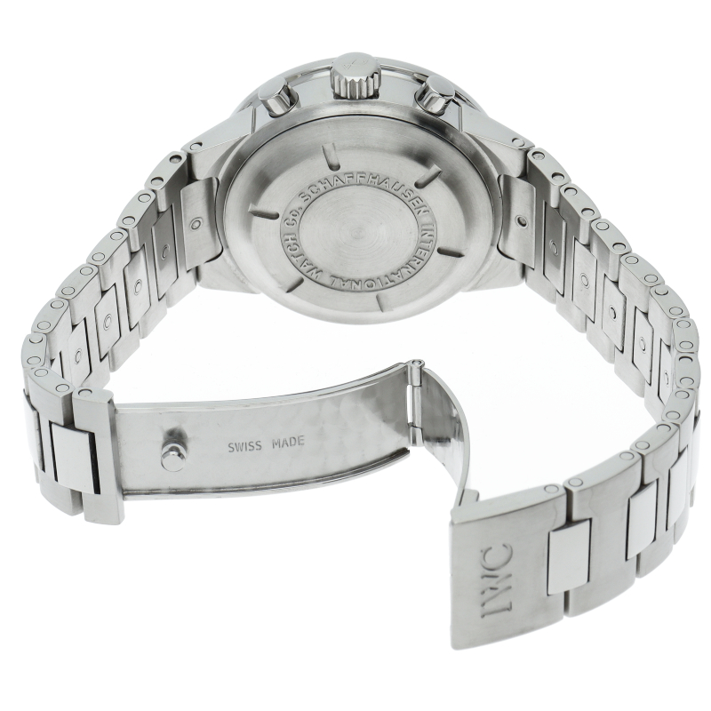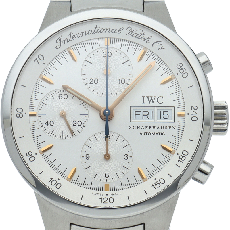 IWCの中でも人気の高いシリーズであった「GSTシリーズ」の中のクロノグラフモデルです。デイデイト表記とクロノグラフが搭載されたモデルでありながら、視認性の高い時計でもあります。