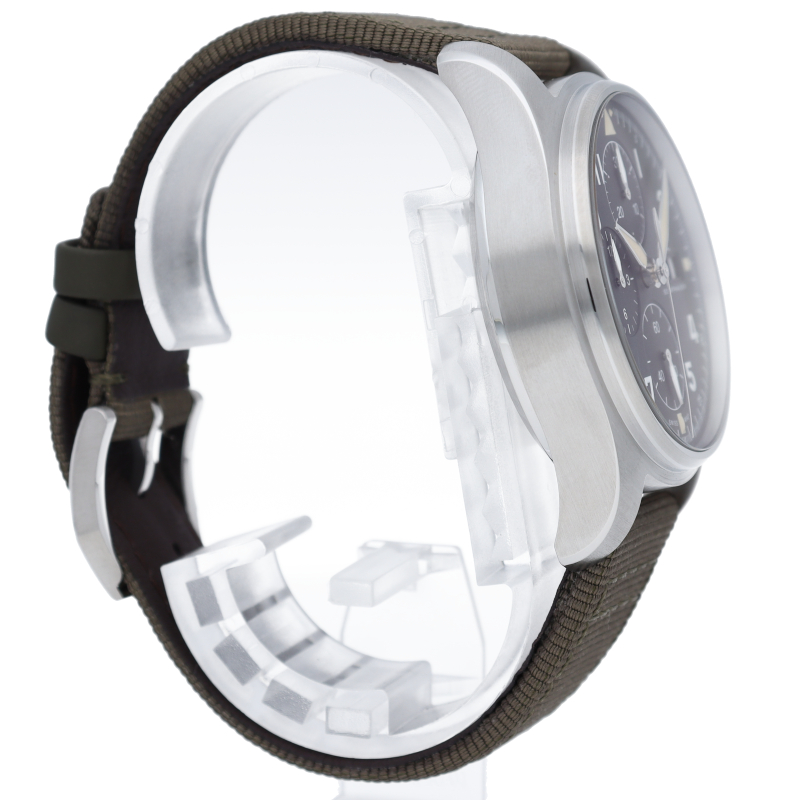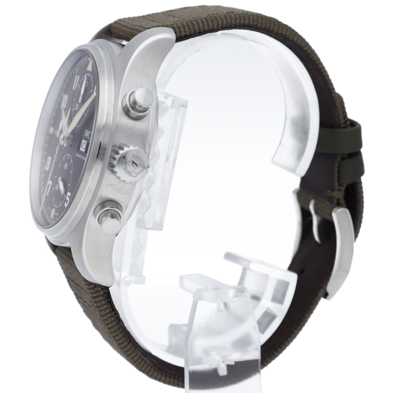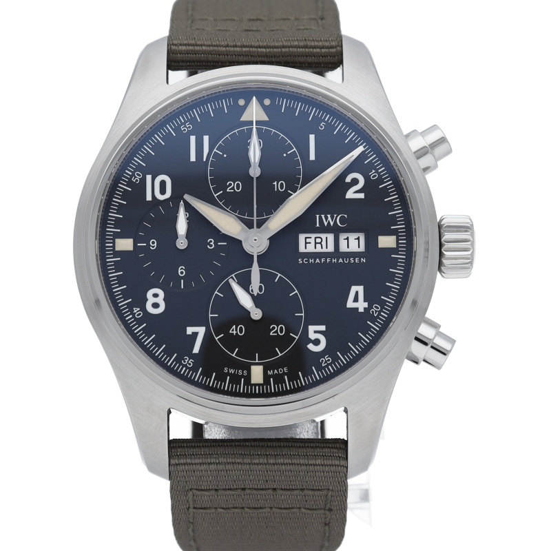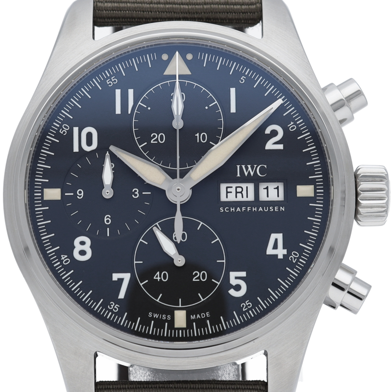 IWC史上初の、直径41mmにサイズダウンしたケースにキャリバー69000シリーズのムーブメントを搭載したパイロット・ウォッチ・クロノグラフです。伝統的なコラムホイール・デザインの頑丈なクロノグラフ・ムーブメント、IWC自社製キャリバー69380を搭載。9時位置と12時位置にある2つのサブダイヤルで計測された時間と分を表示します。