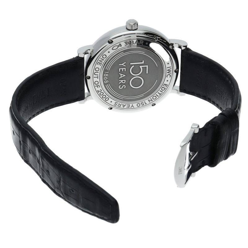 IWCの創立150周年を記念したポートフィノ オートマティック。レギュラーモデルとは異なるブルーラッカーダイヤルを採用。エナメル質で質感の良いブルーラッカーダイヤルは19世紀後半に発表されたパルウェーバー・ポケットウォッチのエナメル文字盤からインスピレーションを得て採用されたものです。裏蓋には「150YEARS」と創立年の1868がエングレービングされています。