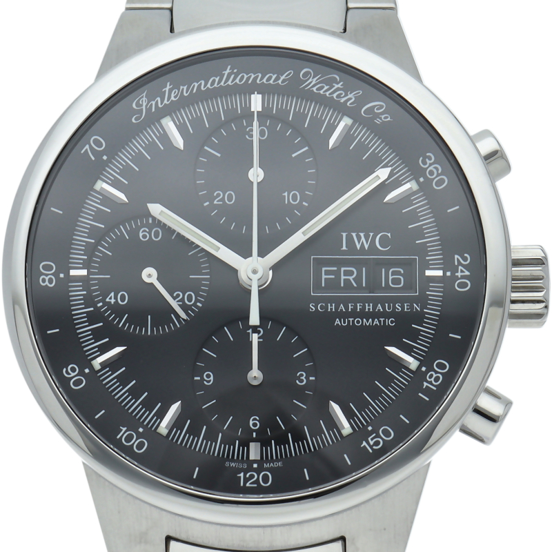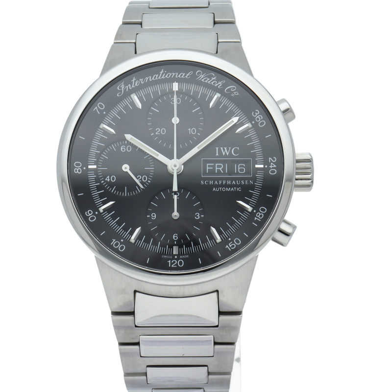 IWCの中でも人気の高いシリーズであった「GSTシリーズ」の中のクロノグラフモデルです。最近は見なくなった筆記体ロゴがファンには嬉しいポイント。デイデイト表記とクロノグラフが搭載されたモデルでありながら、視認性の高い時計でもあります。