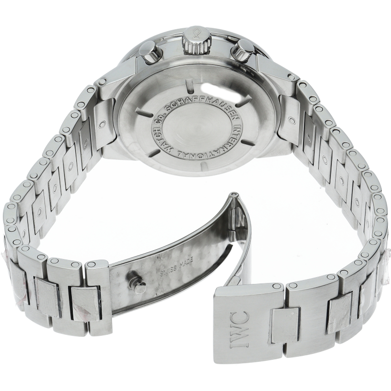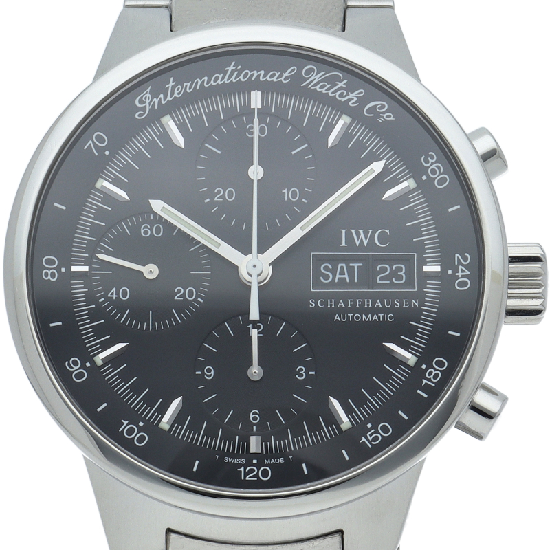 IWCの中でも人気の高いシリーズであった「GSTシリーズ」の中のクロノグラフモデルです。最近は見なくなった筆記体ロゴがファンには嬉しいポイント。デイデイト表記とクロノグラフが搭載されたモデルでありながら、視認性の高い時計でもあります。