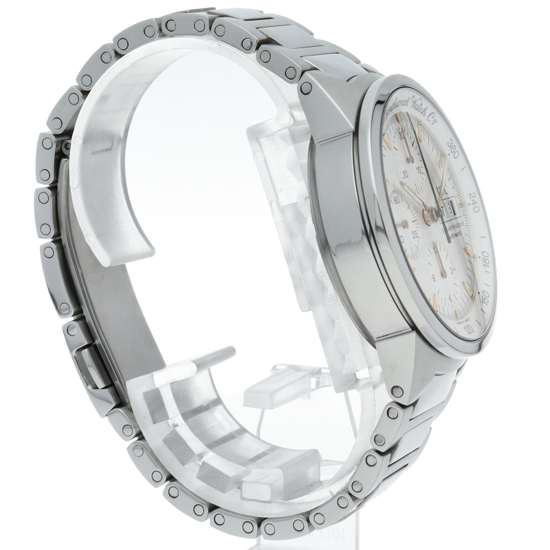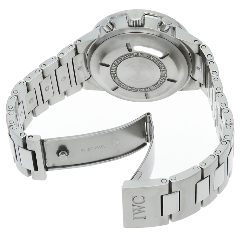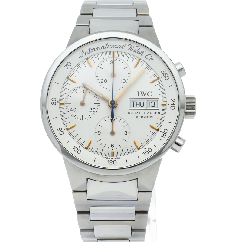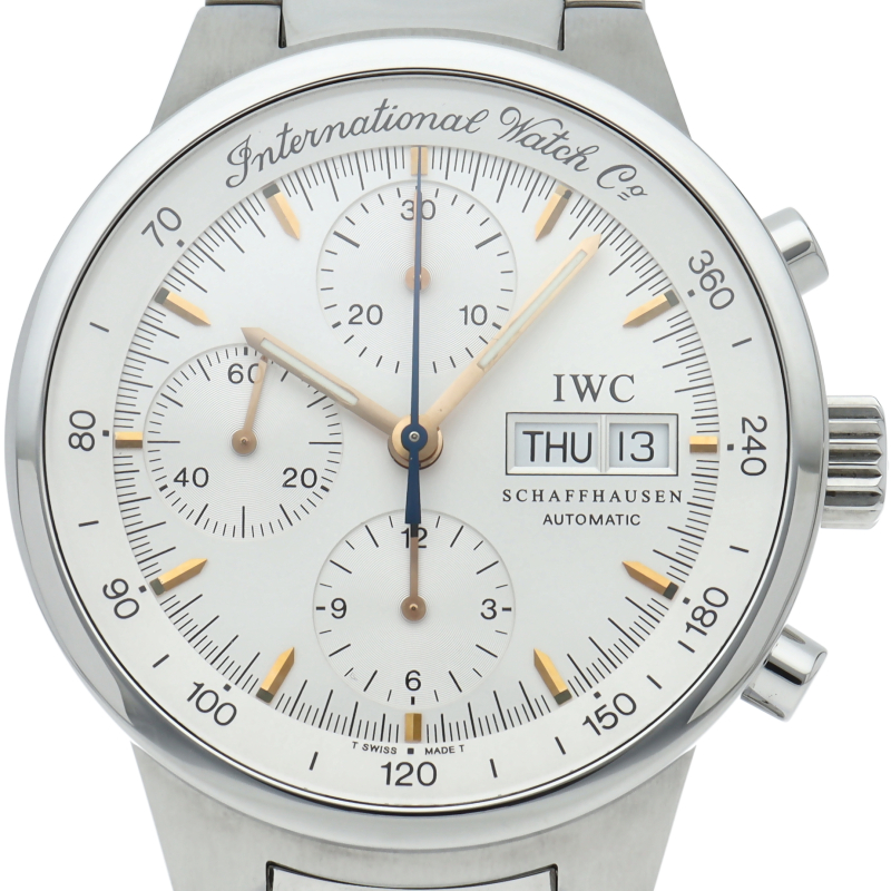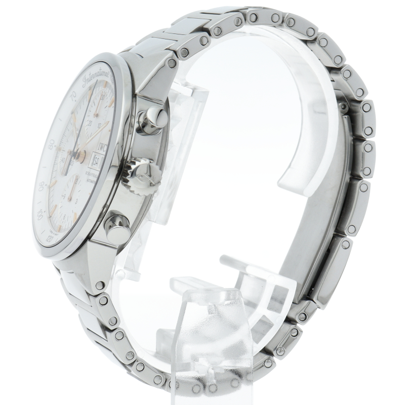 IWCの中でも人気の高いシリーズであった「GSTシリーズ」の中のクロノグラフモデルです。デイデイト表記とクロノグラフが搭載されたモデルでありながら、視認性の高い時計でもあります。