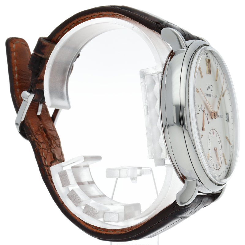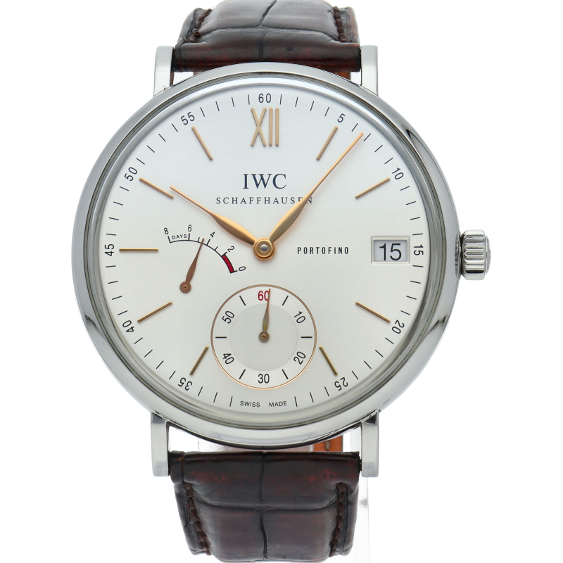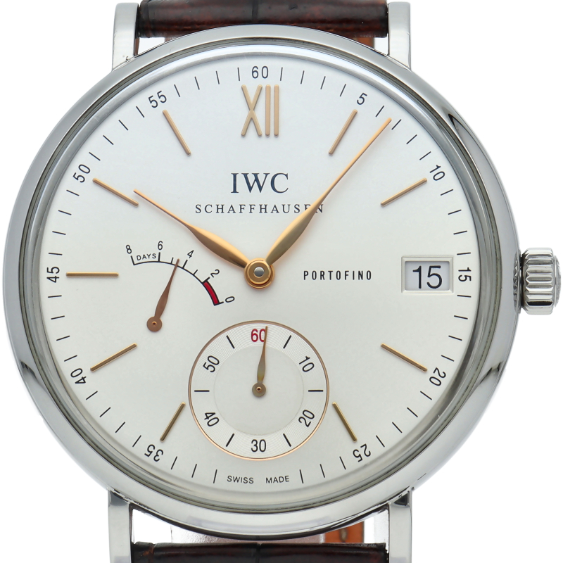 IWCを代表するクラシック・コレクションがポートフィノです。ハンドワインド 8デイズは、ポートフィノコレクションの最上級に位置するモデルです。完全に巻き上げられた場合、8日間巻き上げが不要となる、パワーリザーブが搭載されています。9時位置にインジケーターが搭載されているので、実用に関しても不足はありません。IWC自社製手巻きムーブメントの59210を搭載しています。