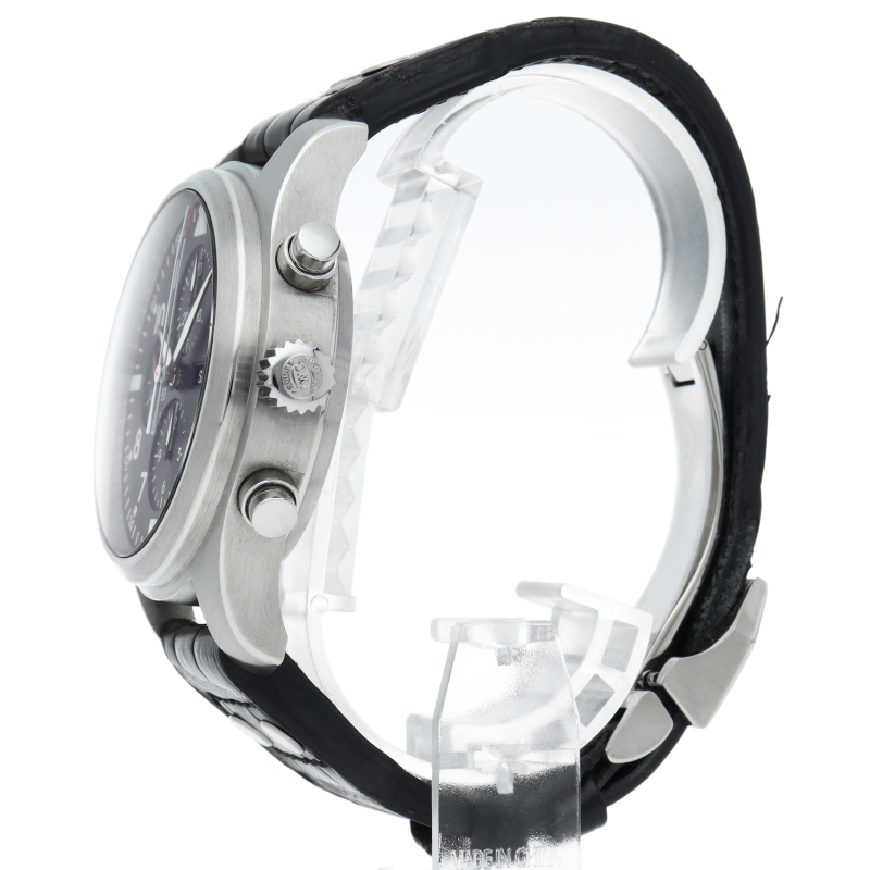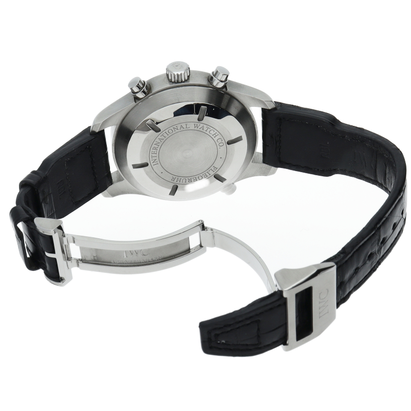 46mmという大きなケースに耐磁軟鉄インナーケースを採用した「パイロットウォッチ ダブルクロノ」。ダブルの名の通りにラップタイム計測が可能なスプリットセコンド機能を搭載したモデルです。 IWCらしい質実剛健なクロノグラフに仕上げられています。