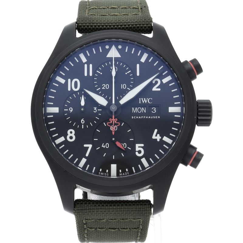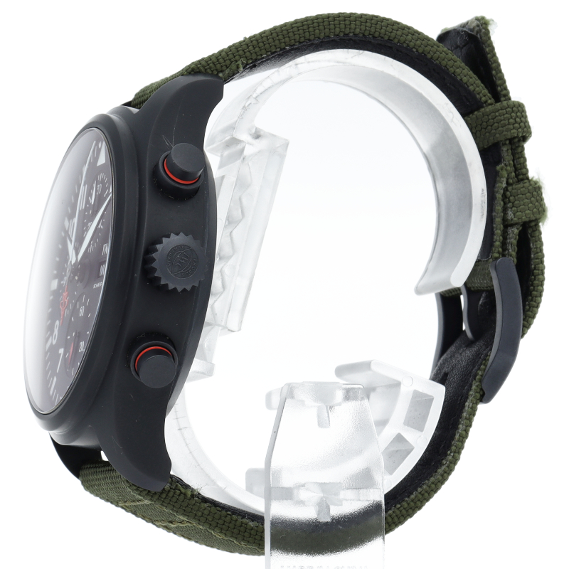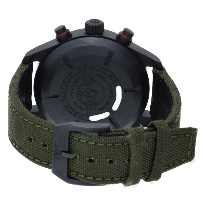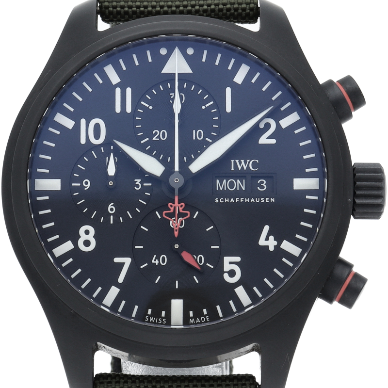 2007年に誕生した「トップガン」シリーズの新作。“SFTI”トップガン卒業生の為に製作された腕時計から着想を得て制作された特別モデルです。海軍ジェットの形をしたクロノグラフ針の尾部のレッドカラーが特徴的です。装着されているファブリックストラップはカーキ色に染め上げられ、他に用いられているカーフストラップとは一味違った印象を与えてくれます。世界1500本限定モデル。