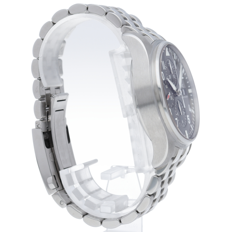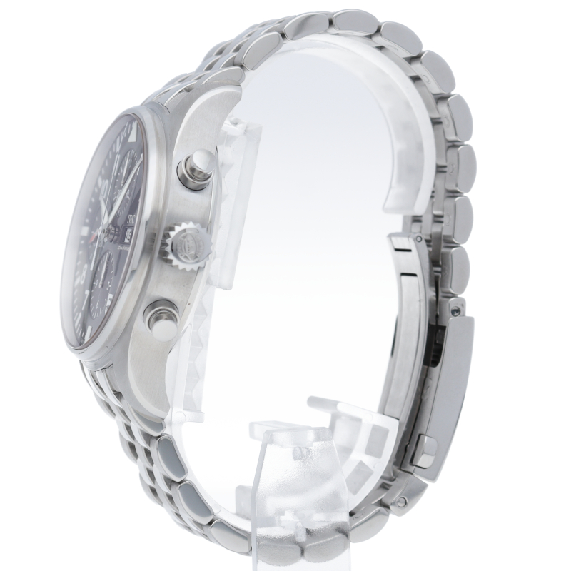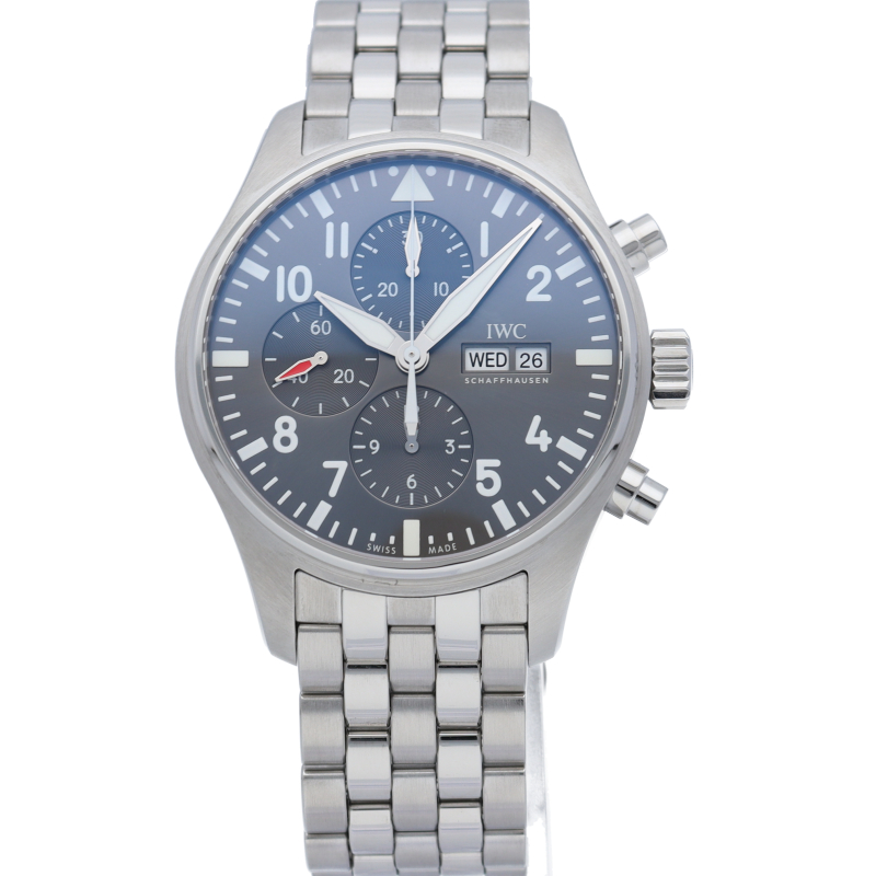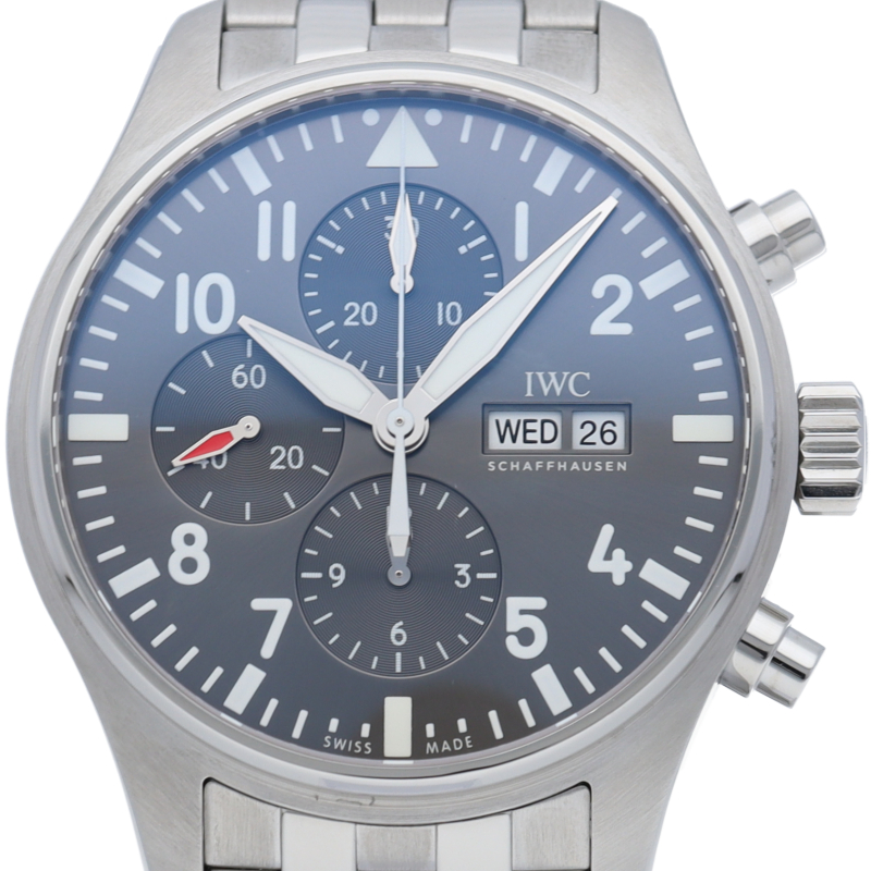 IWC伝統のパイロット・コレクションがパイロット・ウォッチ・クロノグラフです。日付表示は高度計をイメージしたデザインとなり、コクピットを彷彿とさせる演出がなされています。耐磁性軟鉄製インナーケースに保護された、44時間のパワーリザーブを備える、自動巻きムーブメントは79320を搭載しています。