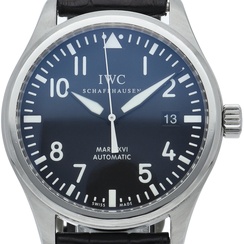 1930年代のマークIVから連なるミリタリーウォッチの流れを現代に踏襲する「マーク16」。耐磁構造のケース等、パイロットウォッチシリーズならではの機能性はそのままに、サイズは現代風にボリュームアップされています。
