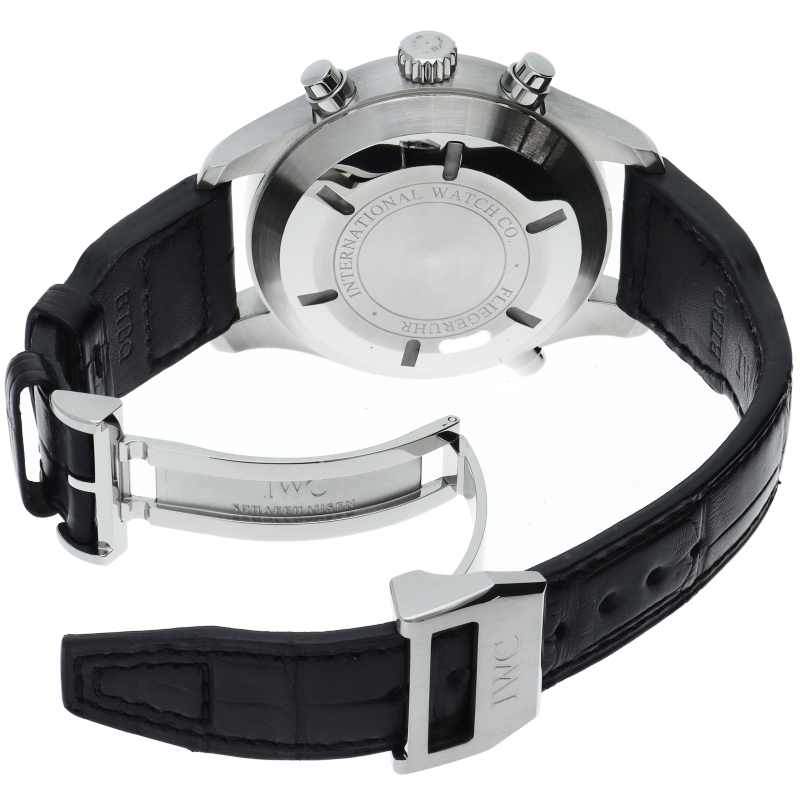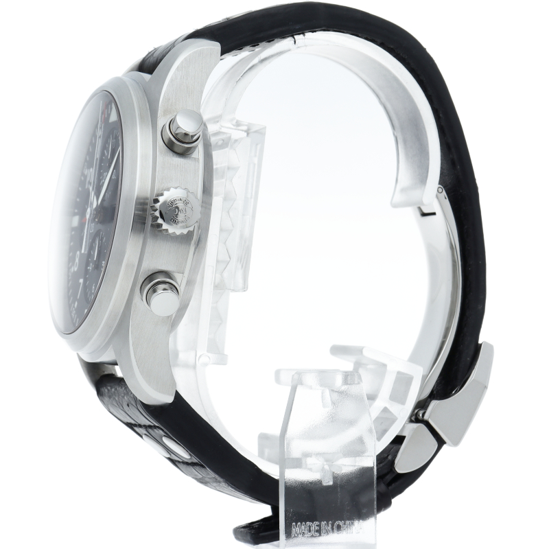 46mmという大きなケースに耐磁軟鉄インナーケースを採用した「パイロットウォッチ ダブルクロノ」。ダブルの名の通りにラップタイム計測が可能なスプリットセコンド機能を搭載したモデルです。 IWCらしい質実剛健なクロノグラフに仕上げられています。