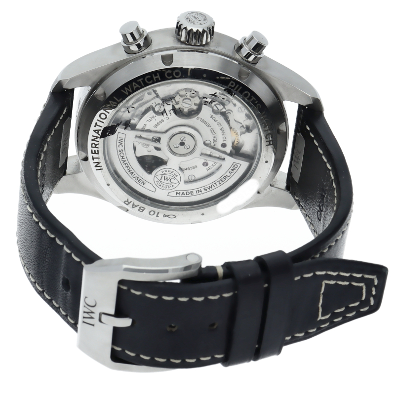 IWC伝統のパイロットウォッチ・クロノグラフです。日付表示は高度計をイメージしたデザインとなり、コクピットを彷彿とさせる演出がなされています。46時間パワーリザーブの自社開発キャリバー69385を搭載。高級クロノの代名詞ともいえる伝統的なコラムホイール式クロノグラフで、ゼンマイを効率的に巻き上げるラチェット式両方向巻き上げシステムを搭載した8振動ムーブメントです。