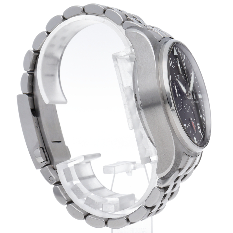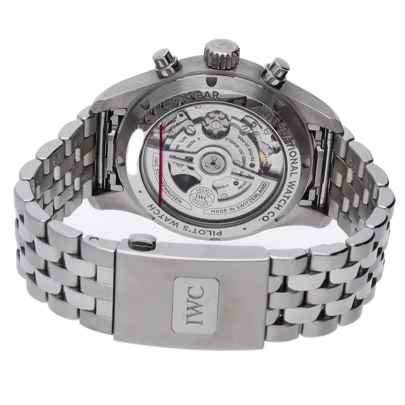 IWCを代表するコレクション“パイロットウォッチ”シリーズのシースルーバック仕様のモデルです。双方向巻き上げでコラムホイール式のクロノグラフムーブメントを搭載しております。ケースサイズは41mmで100m防水と同コレクションとしては防水性能を誇ります。シックなブラック文字盤の6時位置に配置された赤い秒針が目を引くデザインで3時位置にはおなじみの曜日・日付表示を備えます。