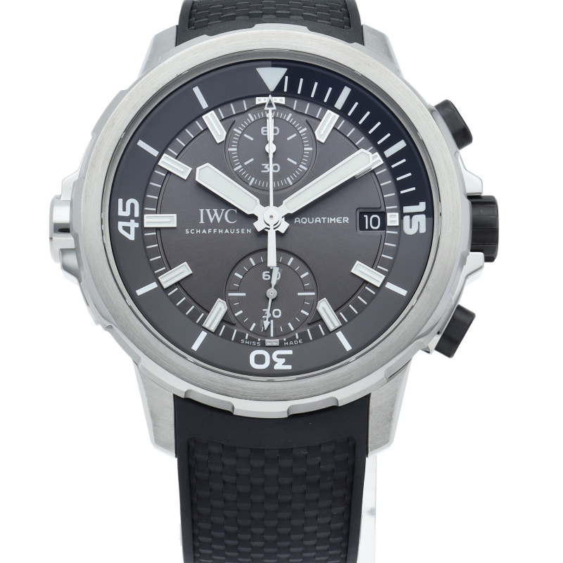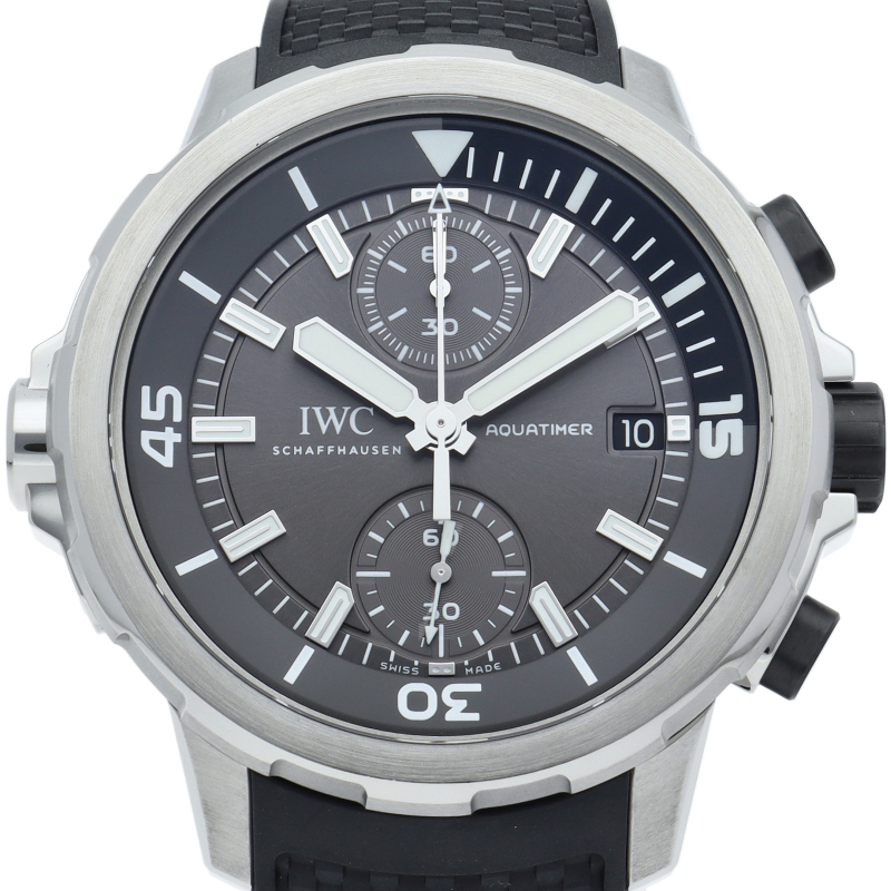 IWCを代表するダイバーズウォッチ「アクアタイマー」シリーズより、2017年に発売された500本限定モデルです。米国出身の有名写真家マイケル・ミュラー氏と芸術書の大手出版社タッシェンがタッグを組み誕生した「アクアタイマー・クロノグラフ・シャーク」。裏ブタには限定モデルの証としてシュモクザメが遊泳する姿がエングレービングされています。