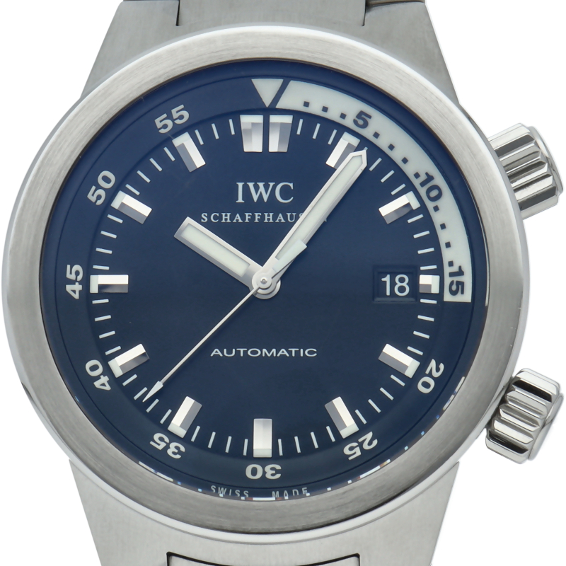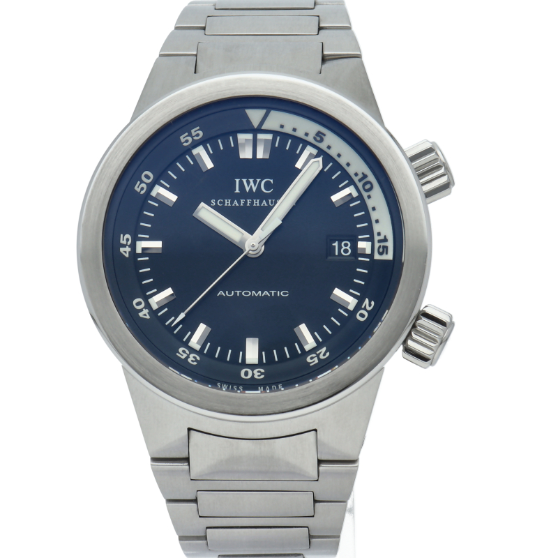 IWCが誇る伝説のダイバーズウォッチ「ディープワン」を彷彿とさせる独特なケース形状と大型リューズが特徴のアクアタイマー。IW329002とは違い、ベゼルに凹凸が無いのでスリムな印象があるデザインで、2つのリューズとインナーベゼルがさり気なく個性を主張しています。